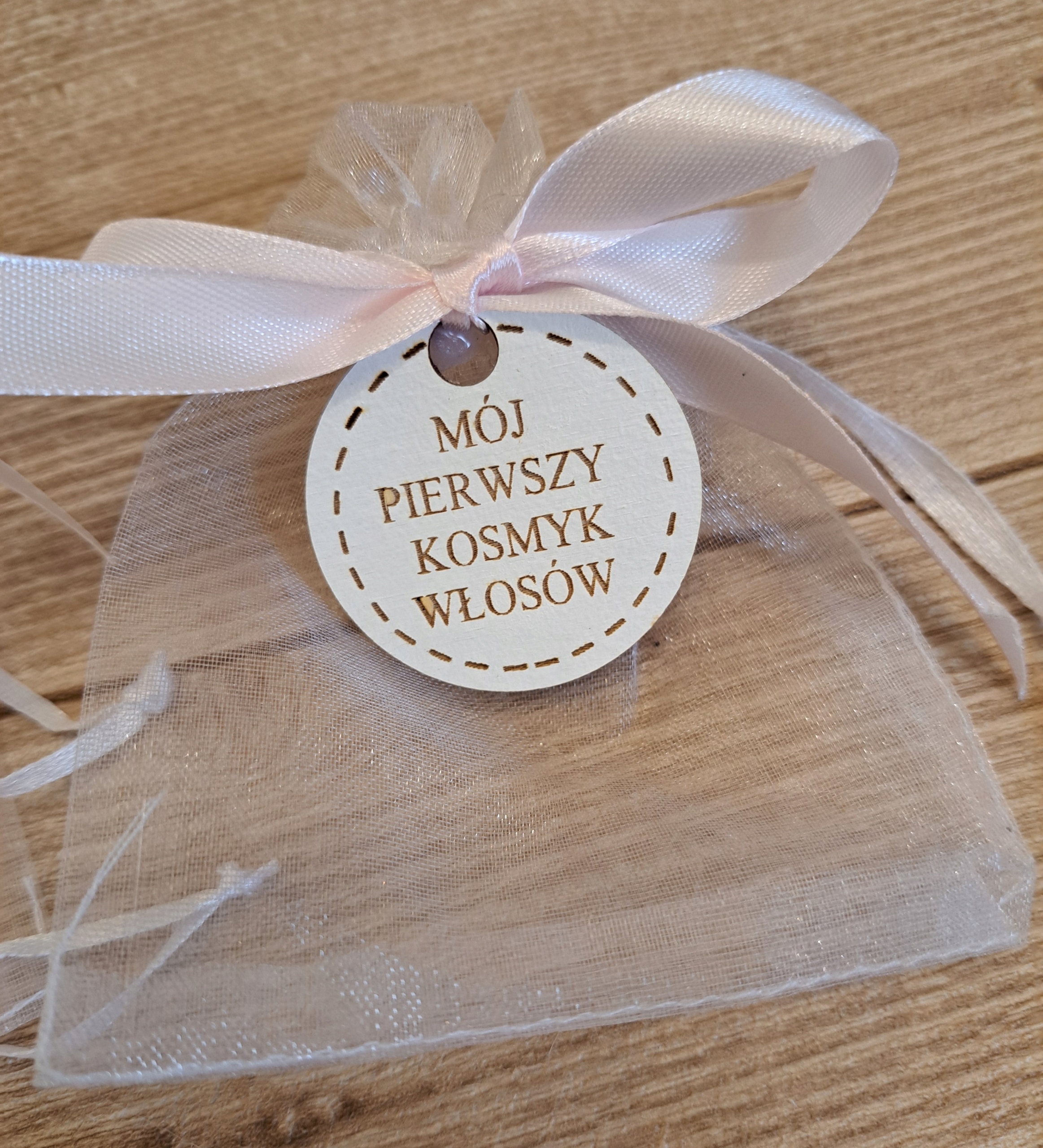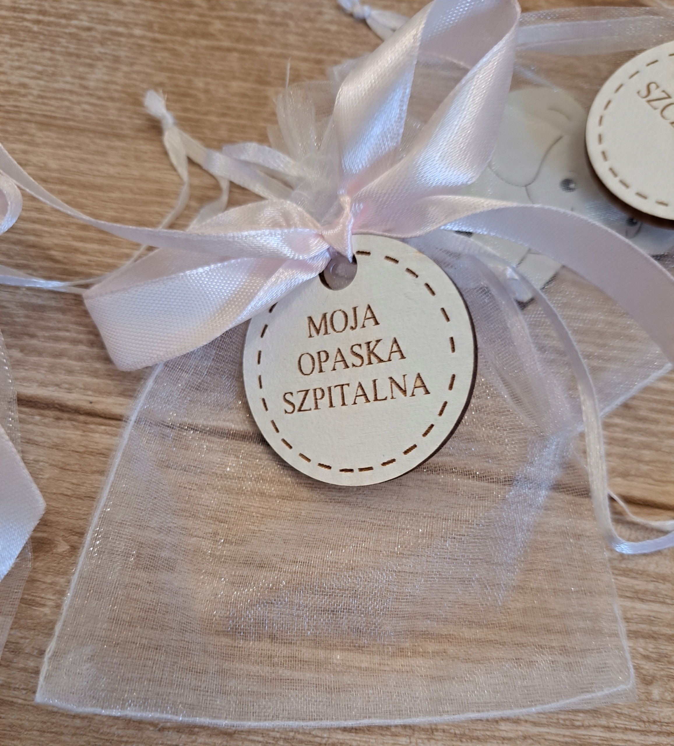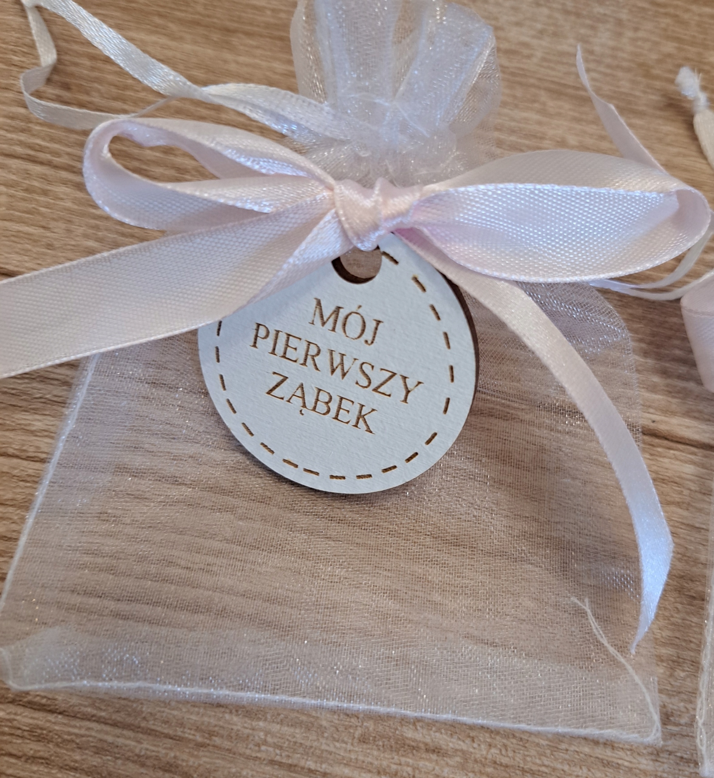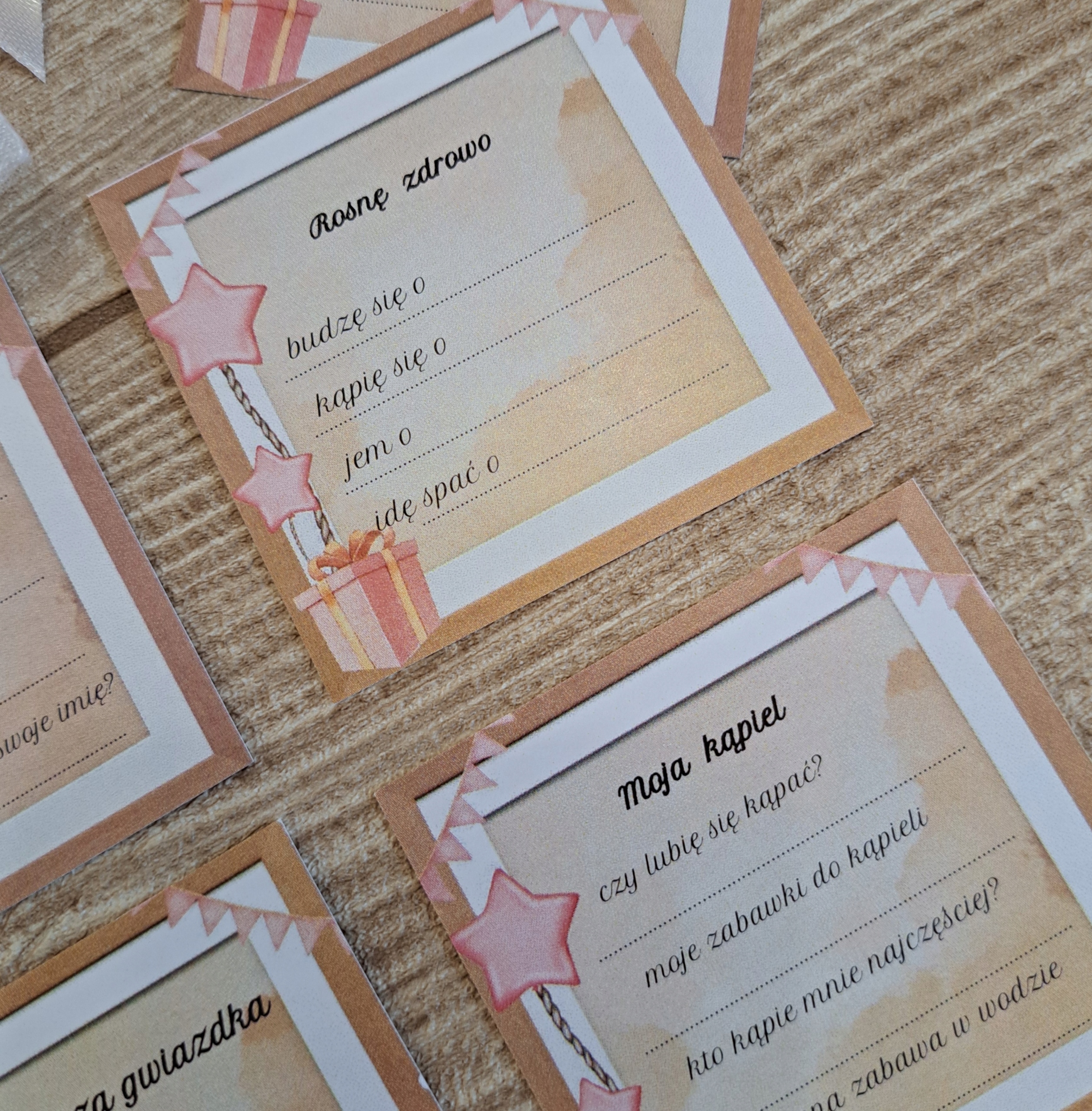 Внутри коробки 8 пакетиков с декоративными розовыми бантами, к которым прикреплены деревянные подвески с надписями: