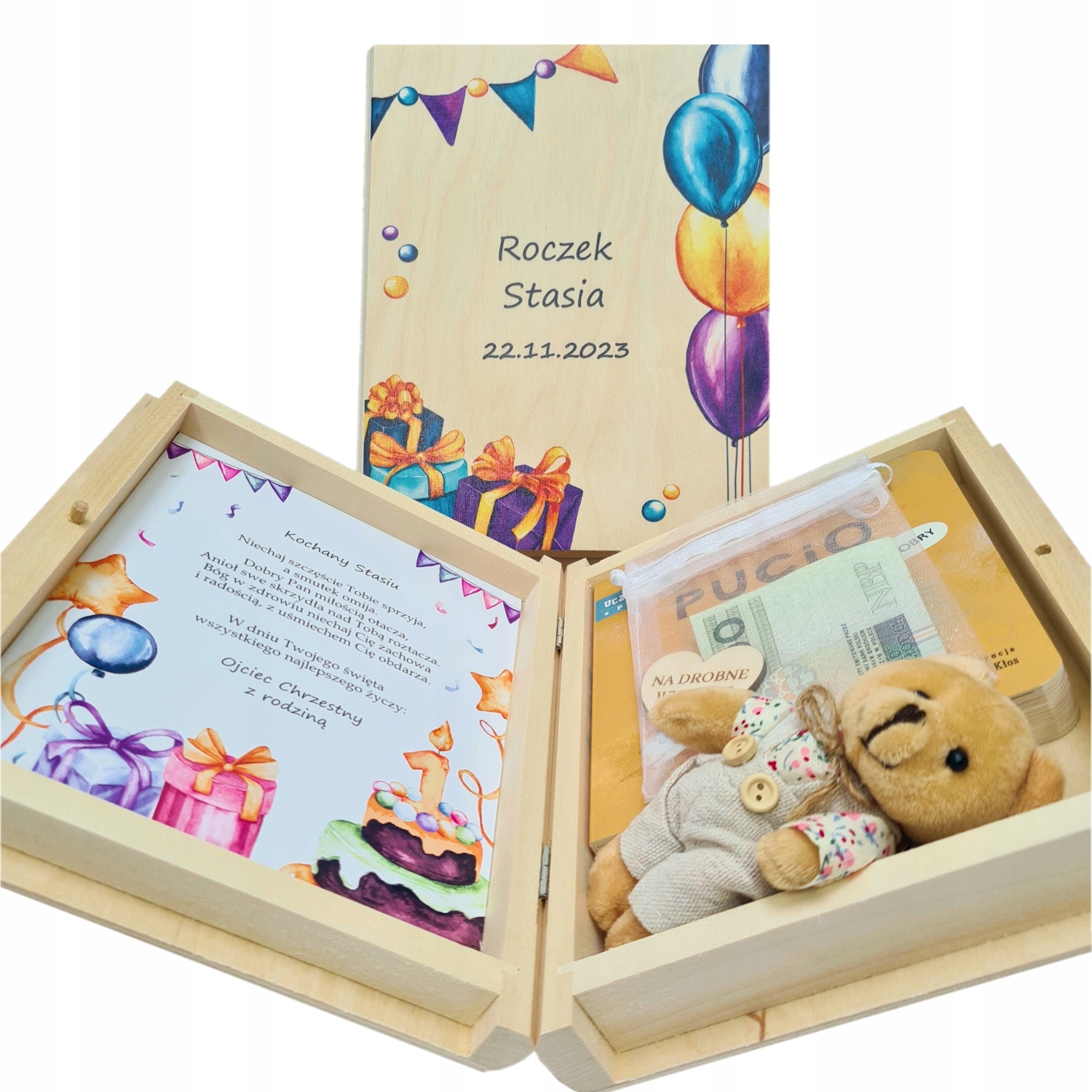 - полностью персонализированная коробка для годовалого ребенка в форме книги размером 21,5 x 17,5 x 4,5 см.