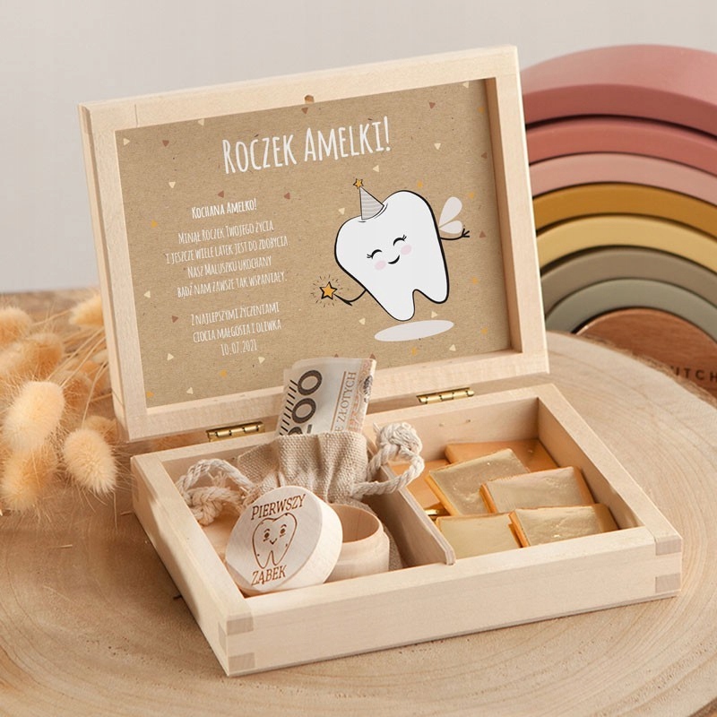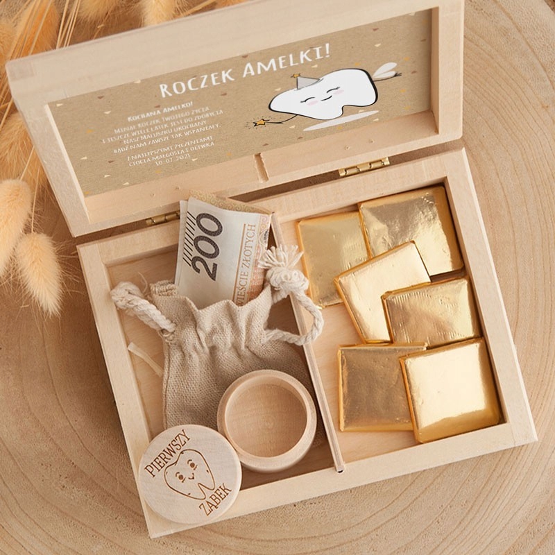 Деревянная шкатулка — отличная идея для подарка годовалому ребенку. Внутри: деревянная коробочка для первого зуба, мешочек для денег и молочные шоколадки. Он дополнен красивой графикой в нейтральных тонах. Благодаря такому сочетанию все выглядит великолепно и идеально подходит в качестве подарка на день рождения мальчику или девочке.