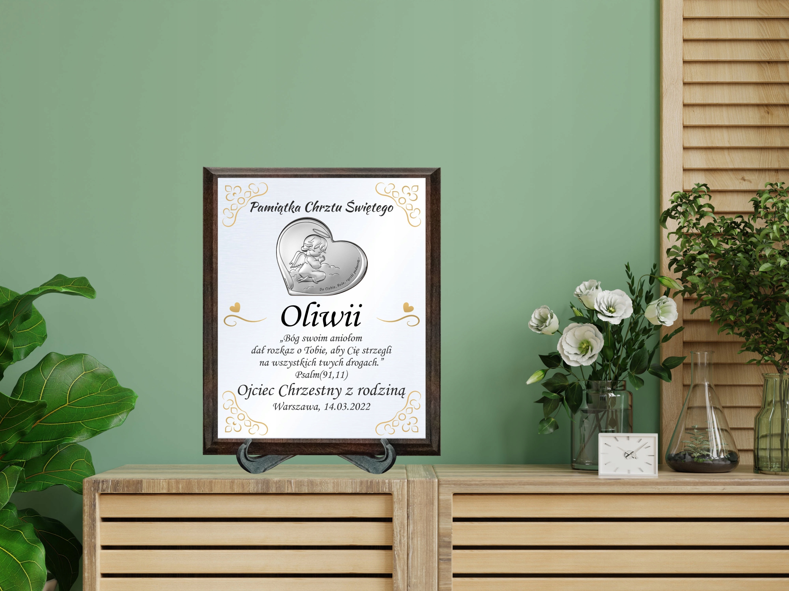 Сохраните особые моменты навсегда с нашим элегантным деревянным панно, которое станет прекрасным сувениром о Святом Крещении! Это тщательно изготовленное панно сочетает в себе дерево, индивидуальное посвящение и красивое серебряное изображение ангела, присматривающего за младенцем. Современный и стильный сувенир ко Святому Крещению, а также прекрасный подарок в качестве украшения детской комнаты.