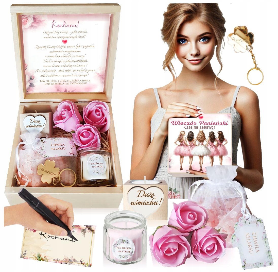Внутри есть, среди прочего, соли для ванн и мыльные цветы, благодаря тому, что вы можете организовать домашний спа. В дополнение к продуктам для расслабляющих ванн. В подарочной коробке также есть ароматная свеча в стекле. К счастью, блестящее дополнение будет золотым ключевым кольцом - четырехлистным клевером.