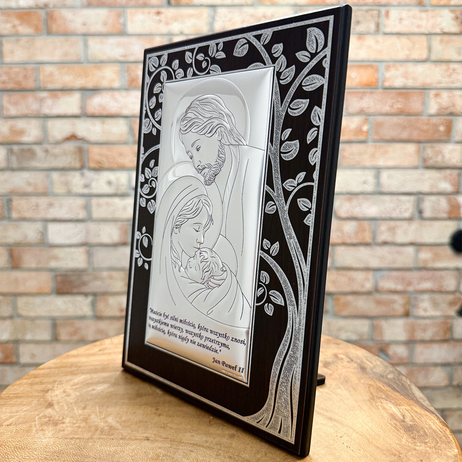 Картина с изображением Святого Семейства – прекрасный подарок на Свадьбу или Святое Крещение. Качественное исполнение, изысканная отделка, элегантная упаковка - все это создает уникальный сувенир на долгие годы... Картина еще и чрезвычайно практична: у нее есть встроенная подставка, поэтому ее можно разместить на шкафу или комоде. или повесьте его на стену.