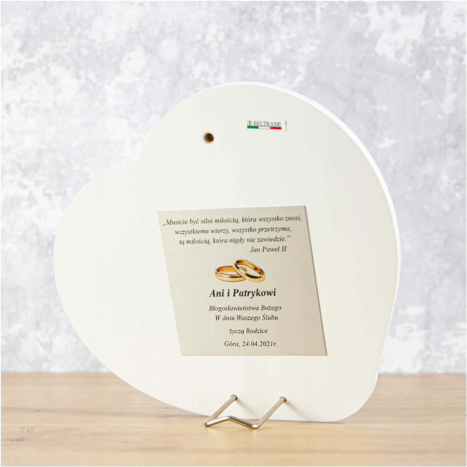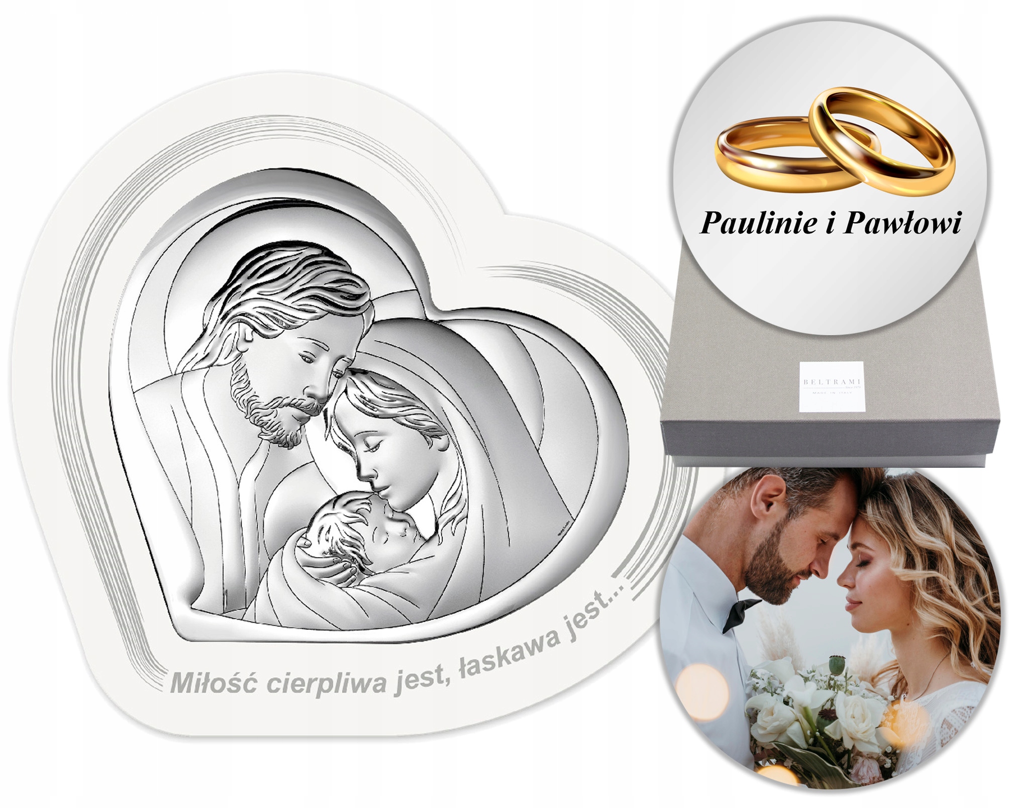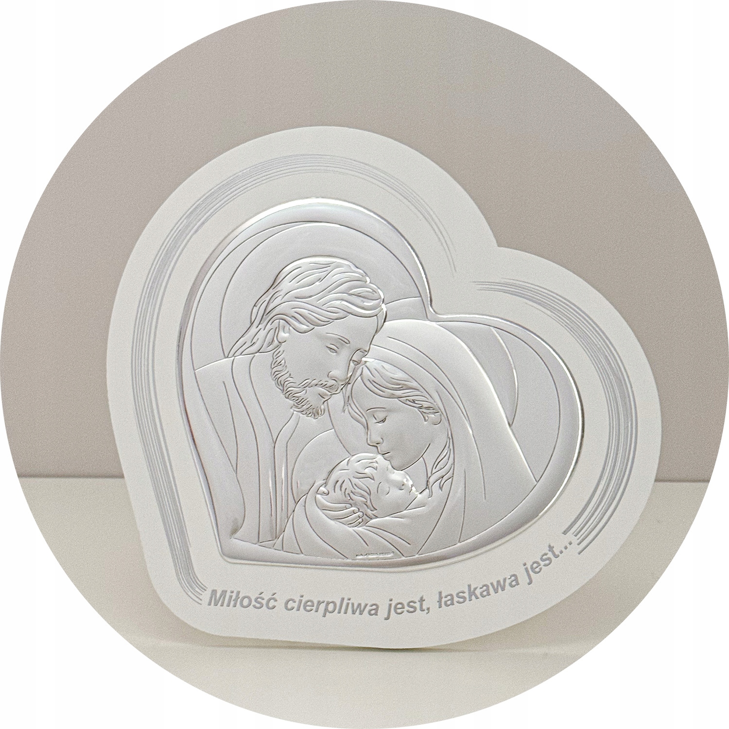 Картина с изображением Святого Семейства в форме сердца на белом дереве – прекрасный подарок на Крещение, Венчание, Первое Святое Причастие, юбилей. Высокое качество исполнения, изысканная отделка, элегантная упаковка - все это создает уникальный сувенир на долгие годы... Картина еще и чрезвычайно практична: у нее есть встроенная подставка, поэтому ее можно разместить на шкафу или комоде. или повесьте его на стену.
