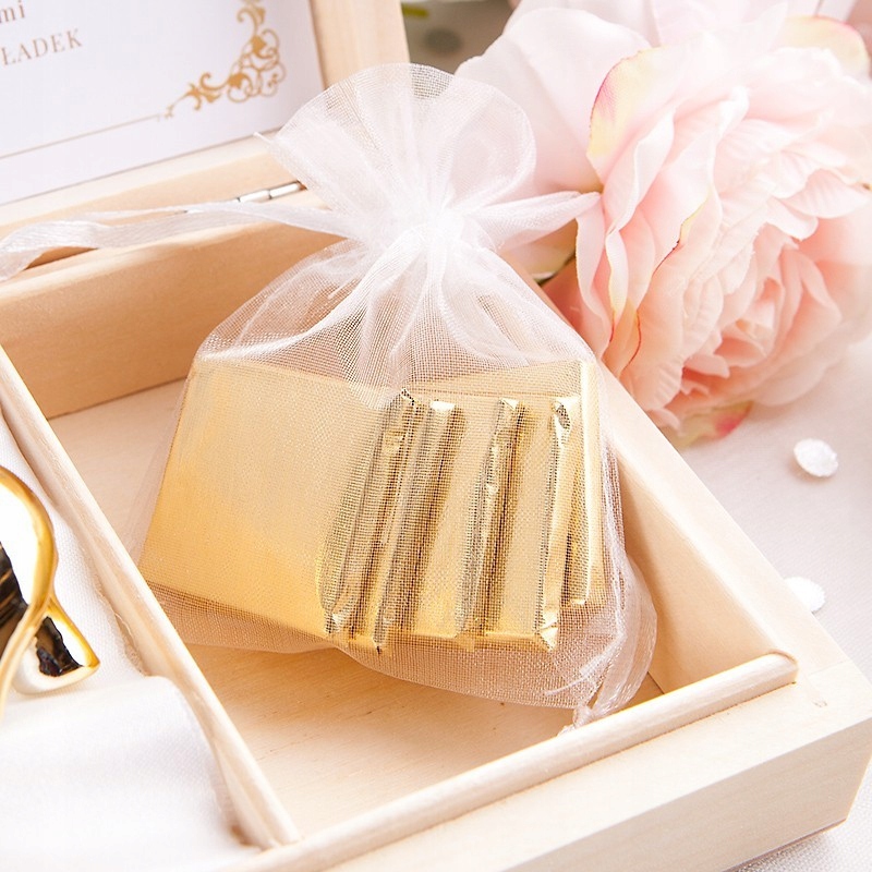 - в коробке золотой слон, помещенный в целлофановый пакет, перевязанный золотым бантом, слон помещен на мягкую вату и шоколадные конфеты в пакете из органзы.