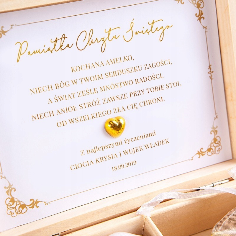 - Внутри коробки также находится открытка с памятным текстом, именем ребенка, датой и именем человека, дарившего подарок.
