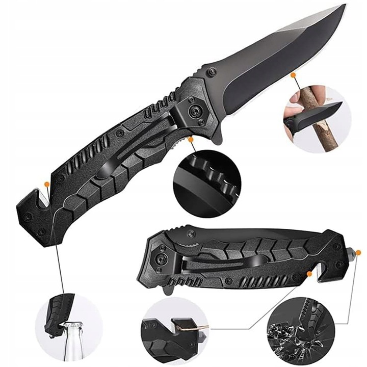 имеет элементарное спасательное оборудование, такое как стеклянный головок и безопасное лезвие с резанием полосы движения. Лезвие точки клипа было сделано из 420 нержавеющей стали и покрыта черным защитным слоем. Он оснащен гладким лезвием и прорезыванием зубов. Нож открывается флиппером и колесом большого пальца. Он был оснащен блокировкой лайнера.