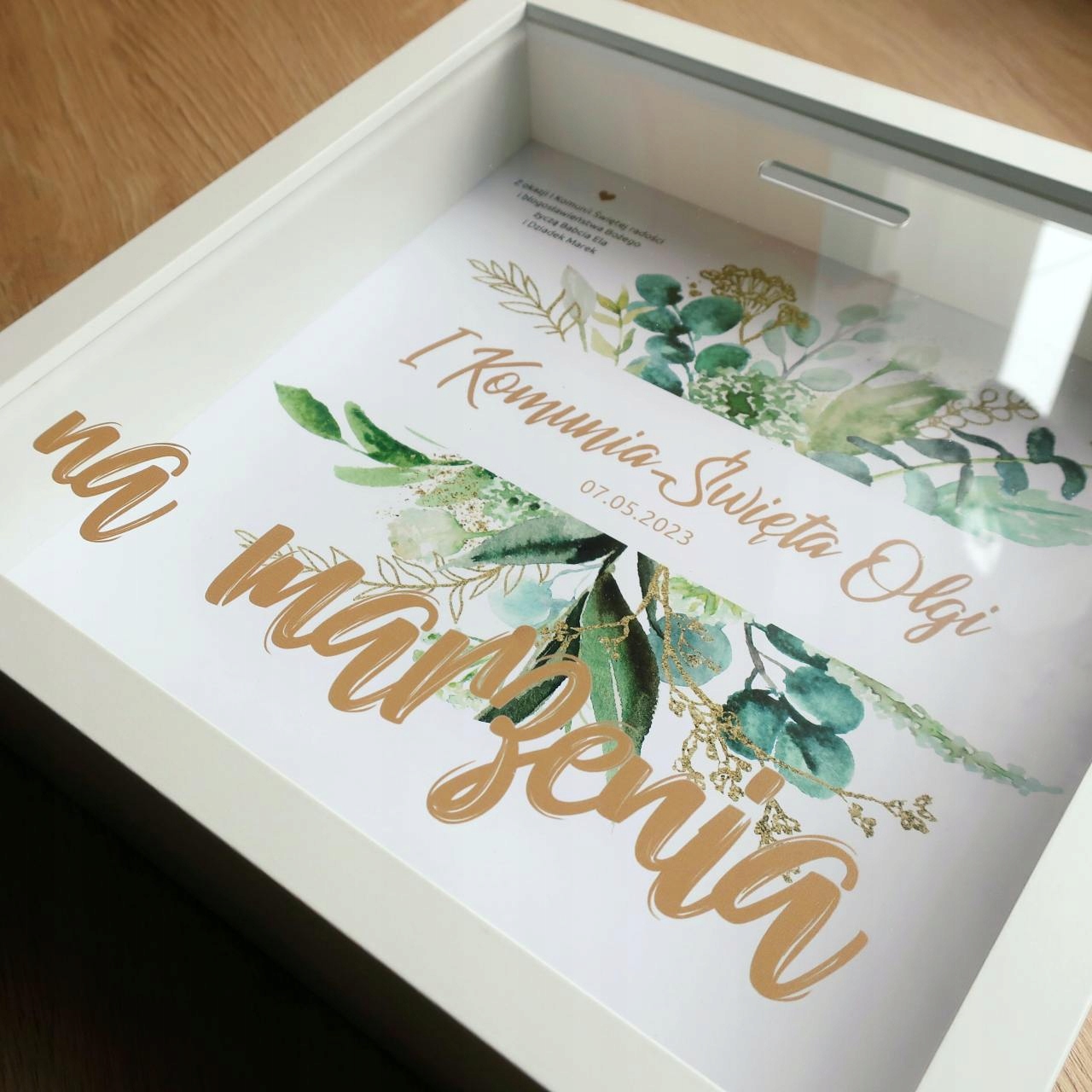 Семейная семья для первого святого причастия с зеленым цветочным мотивом - это не только прекрасное украшение, но и практическое место для сбережения для маленького героя . Уникальный дизайн рамки сочетает в себе элегантность и функциональность, предлагая детям великий сувенир этого важного дня в их жизни, а также практическое место для спасения с мечтами