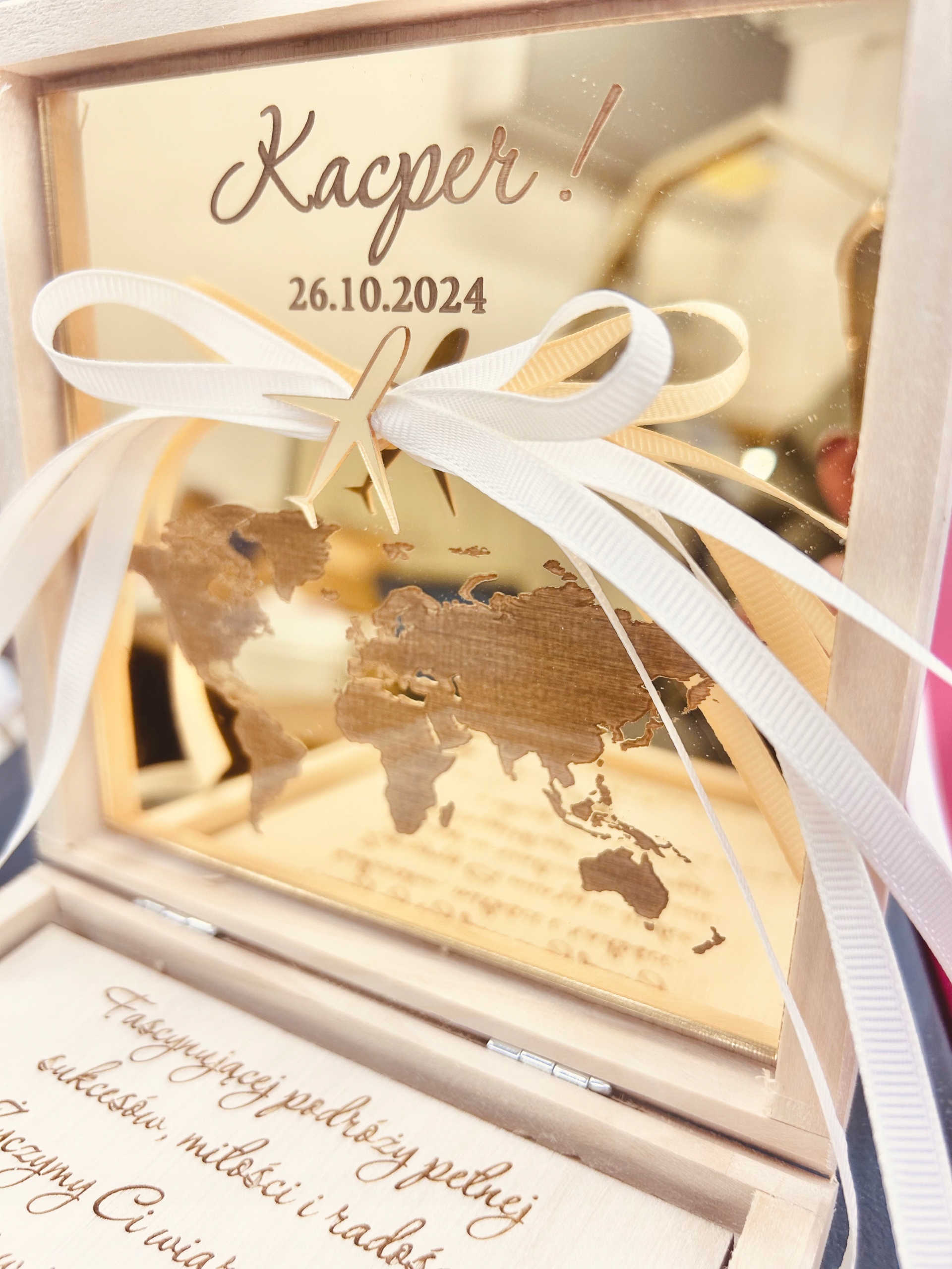 В коробке находятся пожелания и подпись, которую можно персонализировать. На золотой стенке шкатулки выгравировано имя именинника и дата рождения. В коробку можно положить банкноты и другие небольшие подарки, например, скретч-карты или украшения.