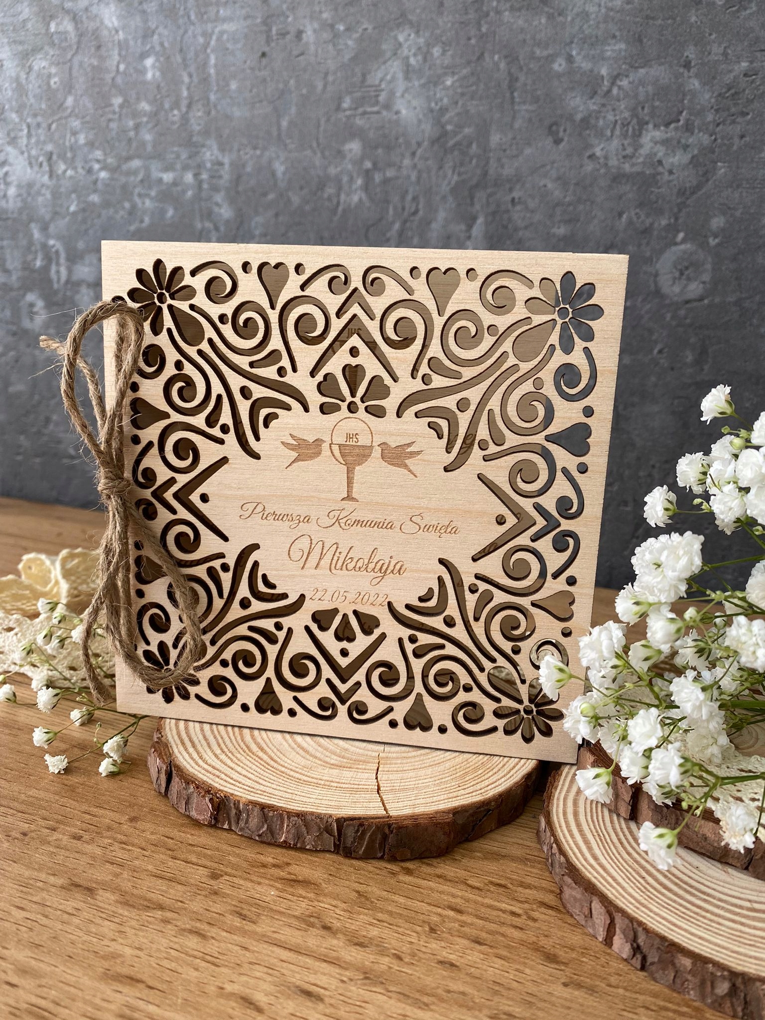 карта, украшенная глубокой лазерной гравировкой в форме хозяина и двух голубей с подписью «Первое святое причастие (имя ребенка + дата святого причастия)» (шаблон, указанный в соответствии с фотографией слева).