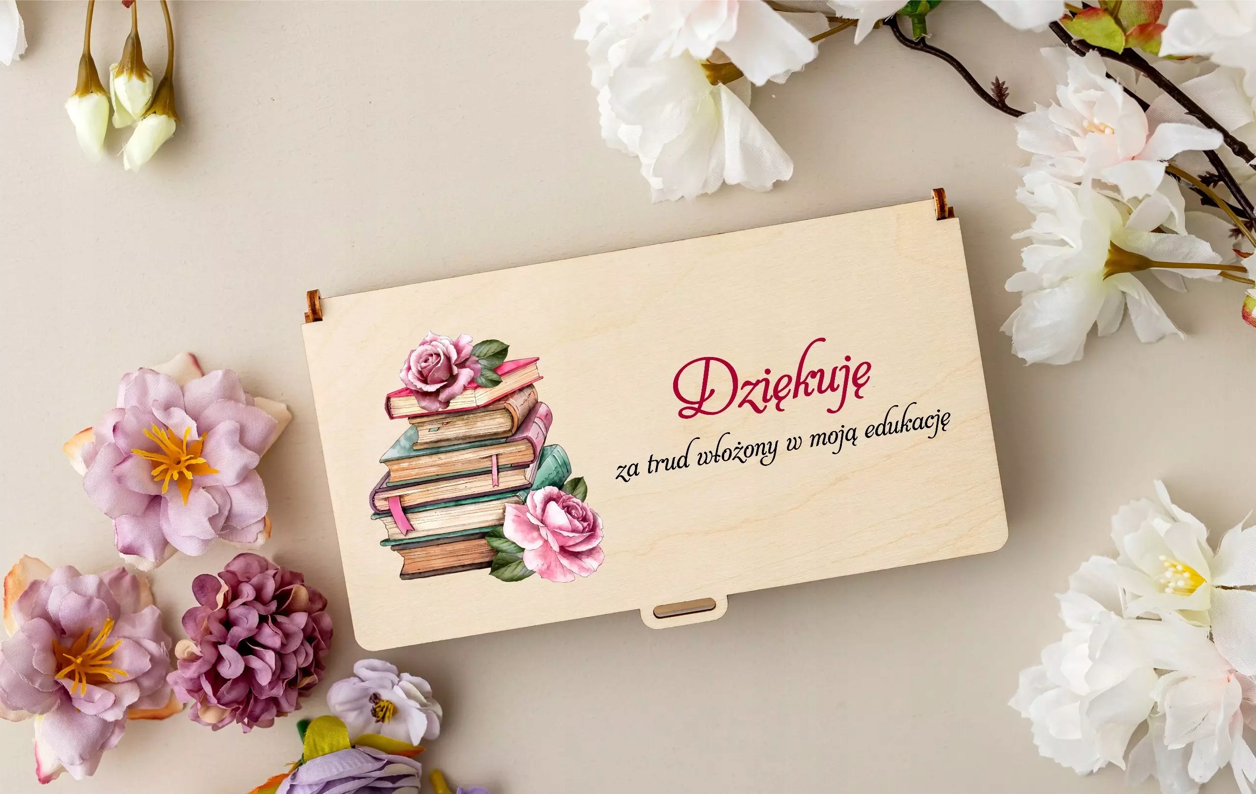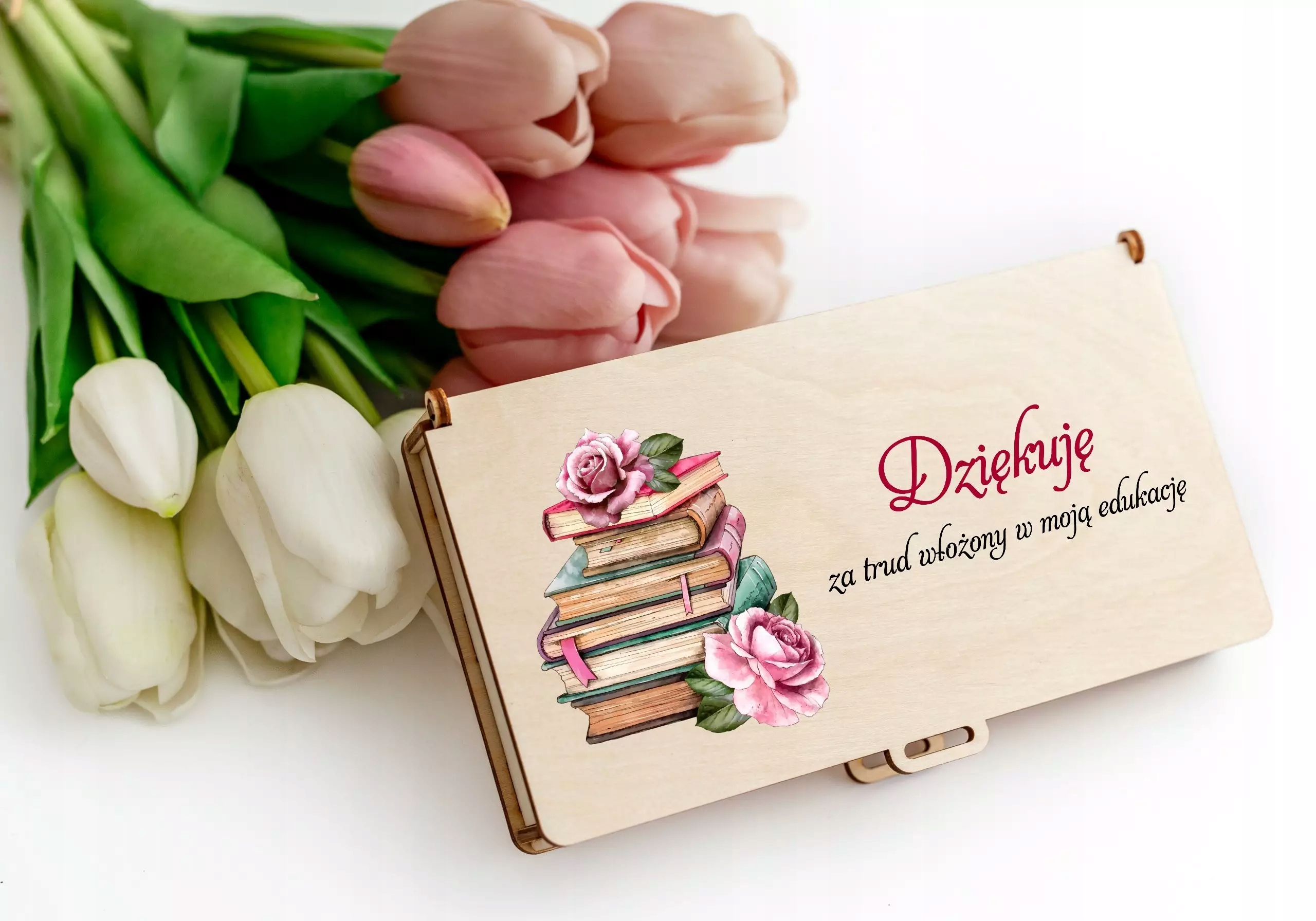 Красивый принт на деревянной коробке добавляет ей очарования и уникальности, что делает ее прекрасным подарком каждому учителю, который может почувствовать себя особенным в этот особенный день.