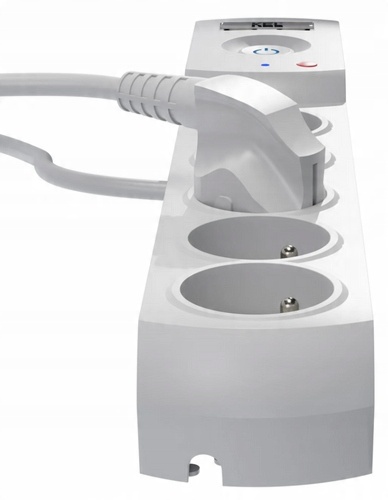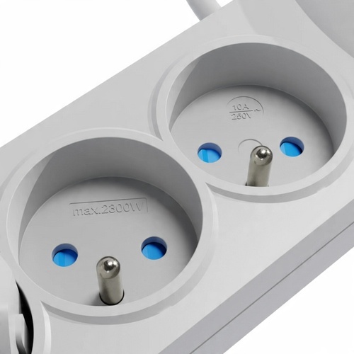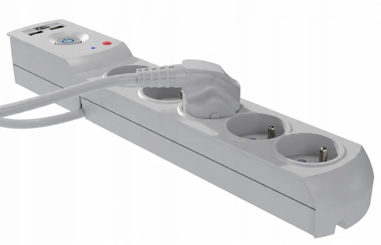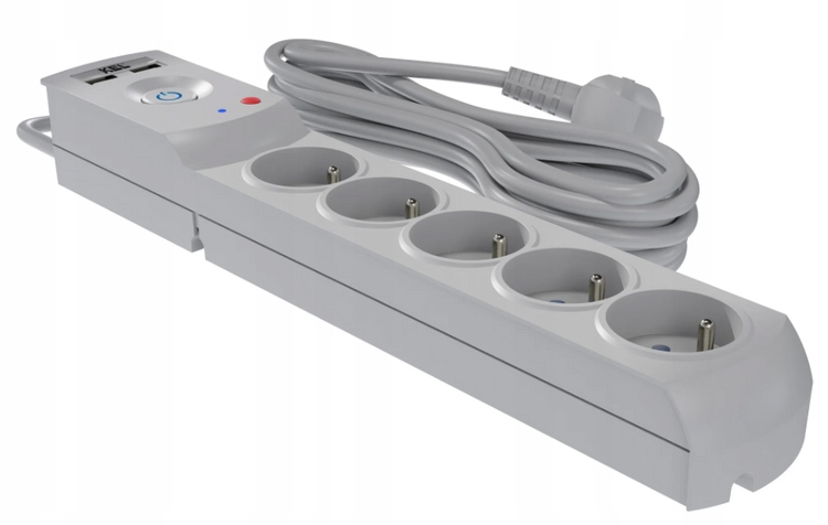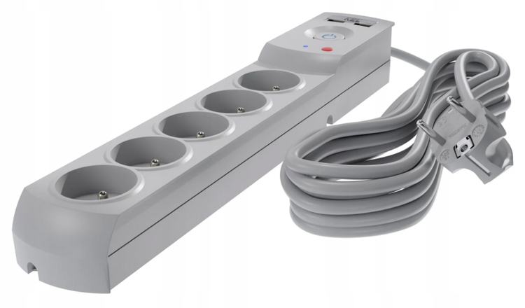 Удлинитель питания с предохранителем и сетевым фильтром профессиональный, 5 розеток, 2 порта USB, длина 5м, 10А, 230В, 2300Вт, серый