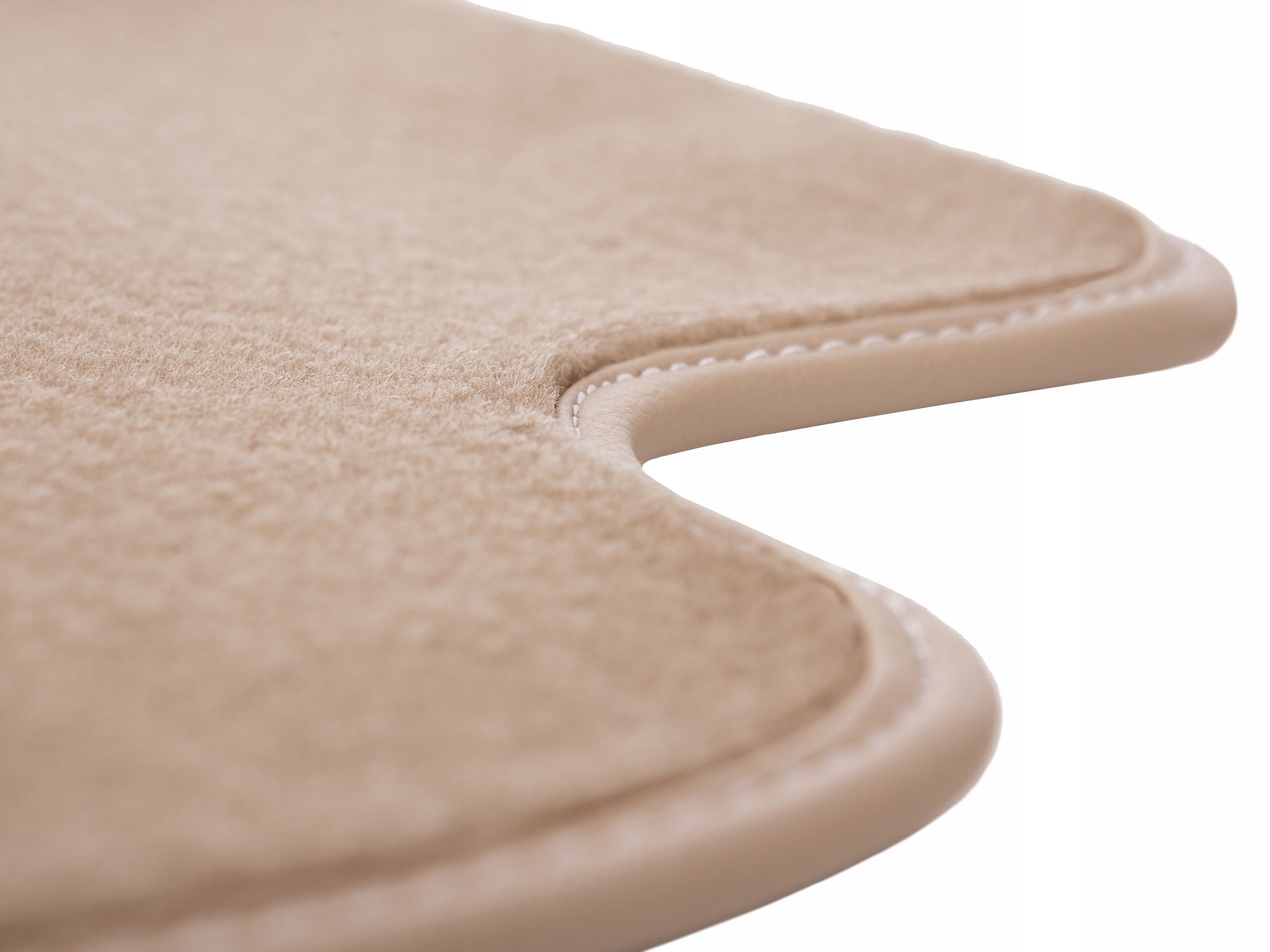 Края ковриков отделаны бежевой отделкой из искусственной кожи. Оттенок ковра, отделка и нитки, которыми он был прошит, подобраны таким образом, что сливаются в одно целостное целое.