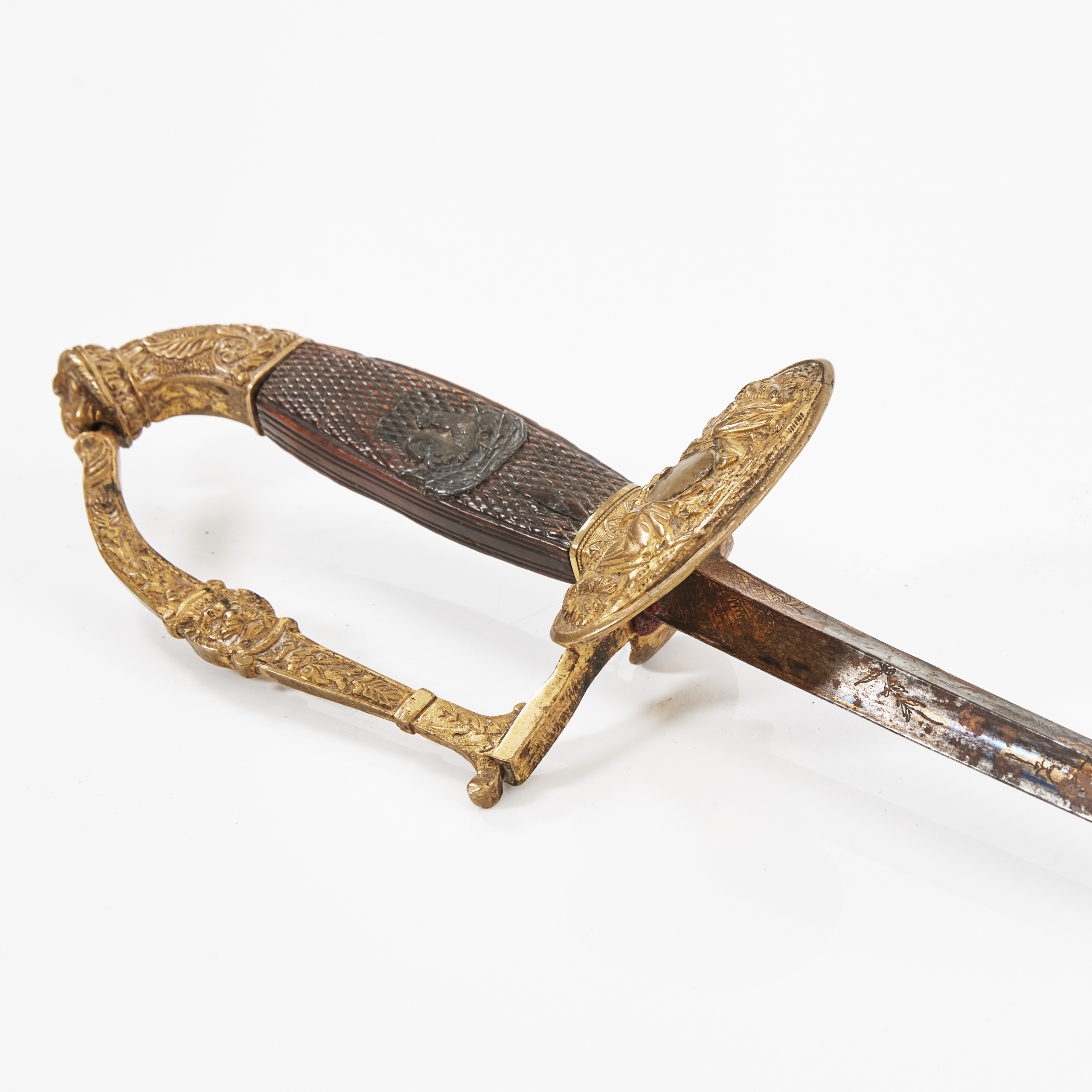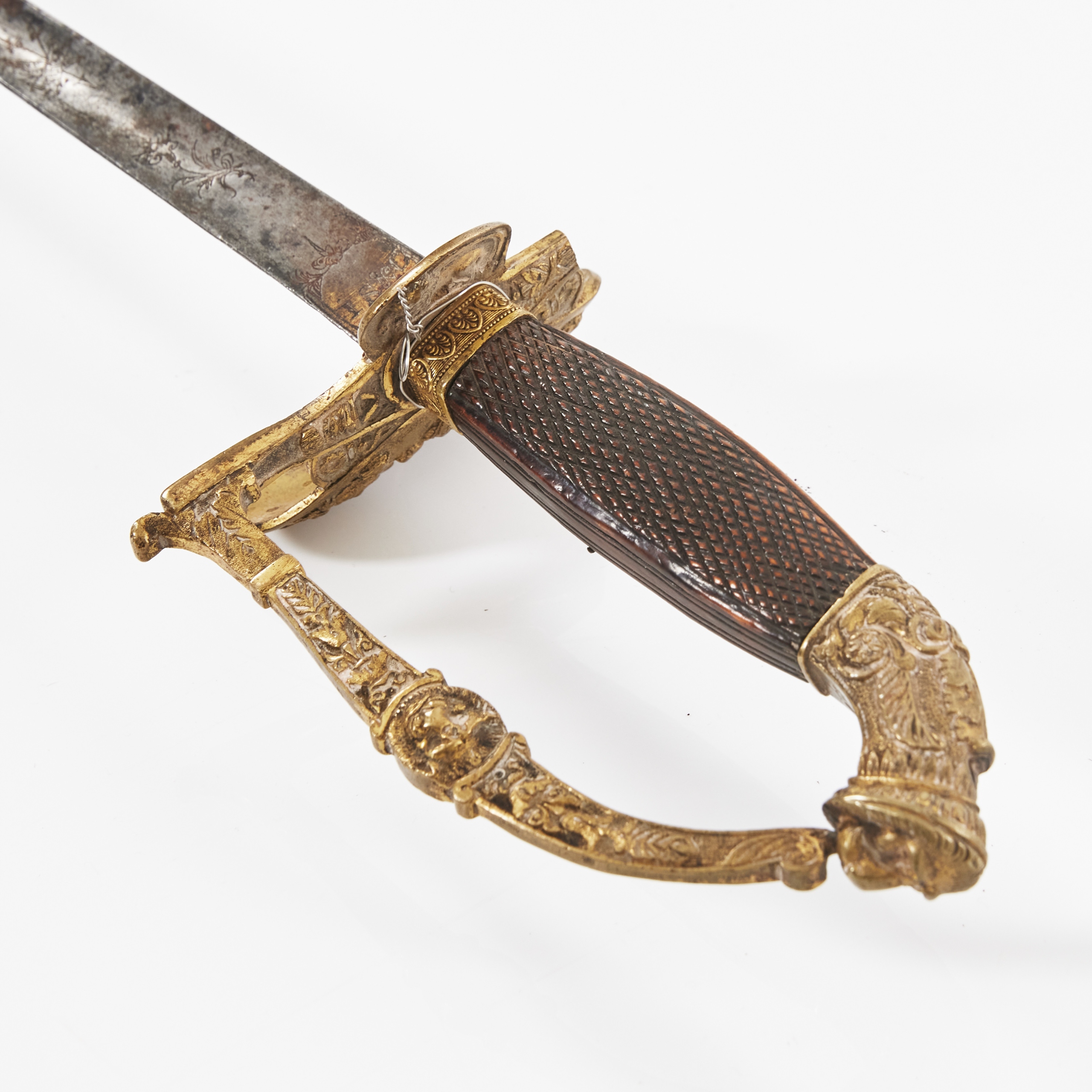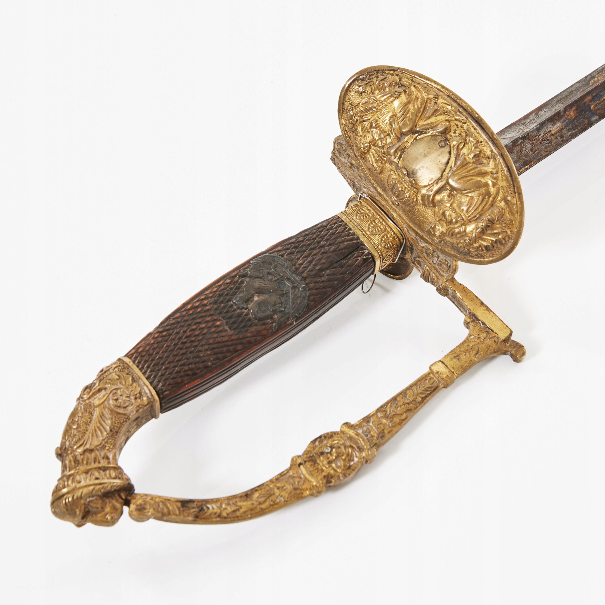 французский офицер французский бронзовый бронза с руками 19 -го по 1820 год! четыре латунных тигеле, наполненных жемчужным золотом; Треугольное лезвие, позолоченное и окисленное в одной трети, подписано: is & c для Йохана Шиммельбуша и компании;