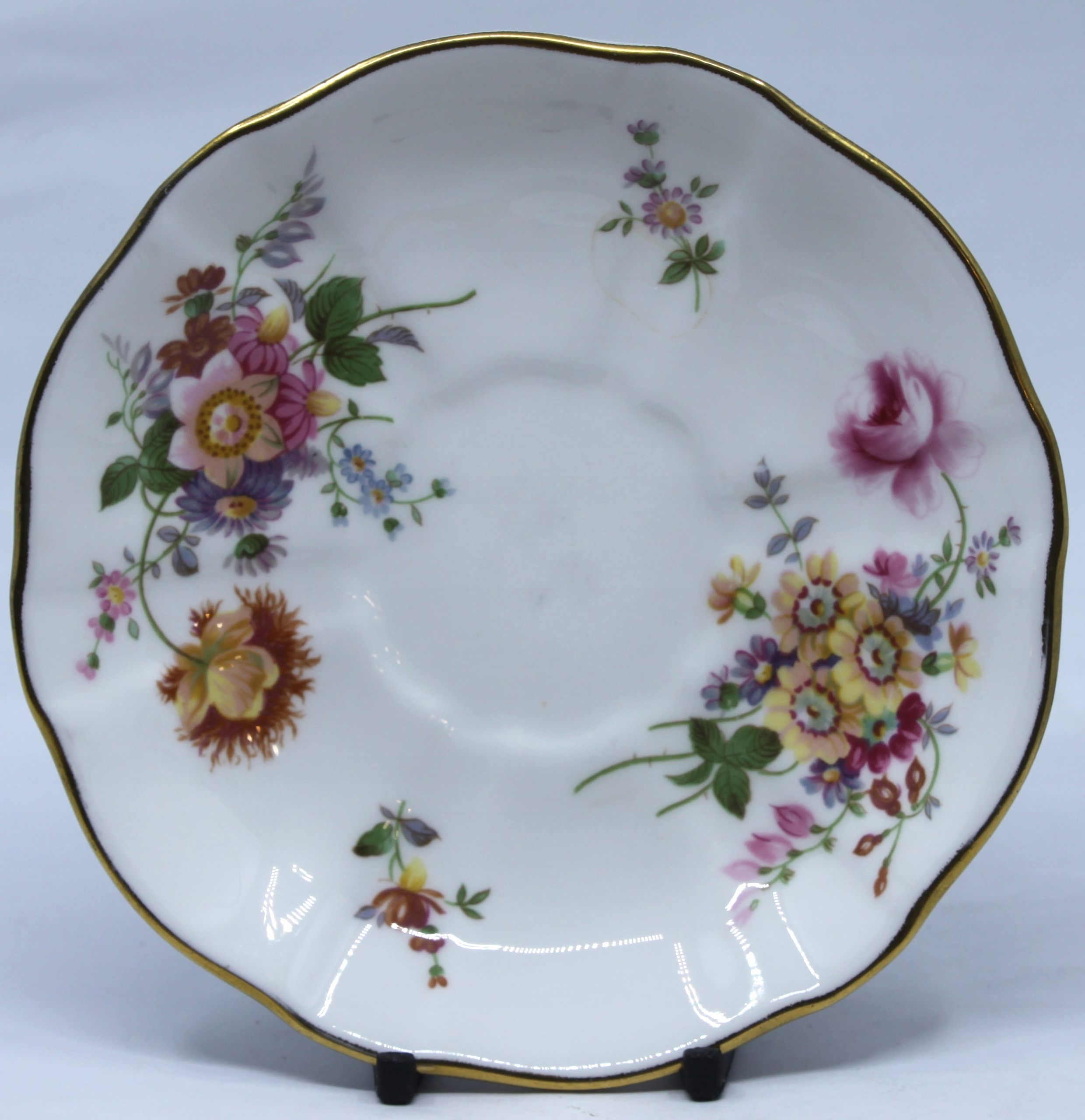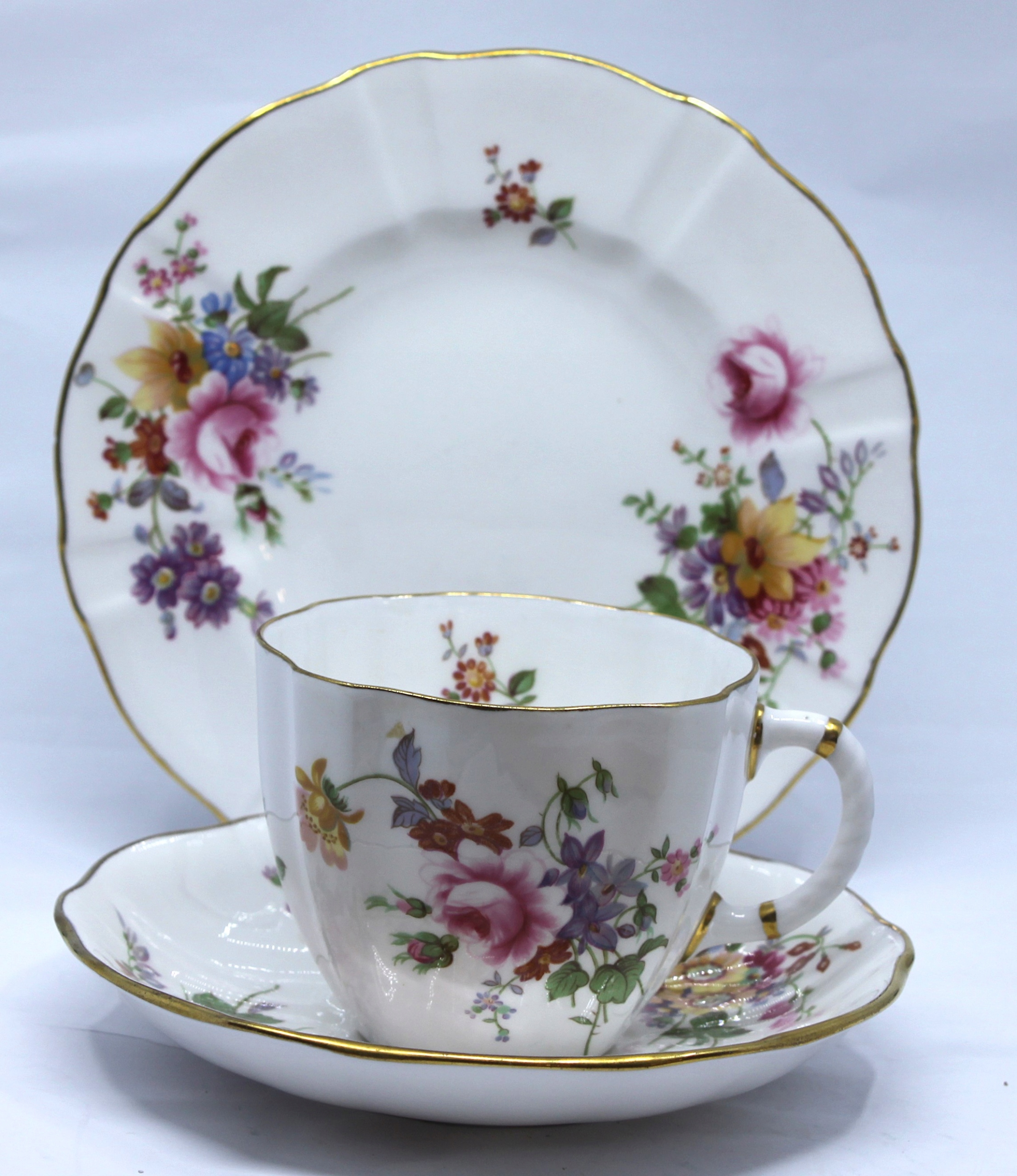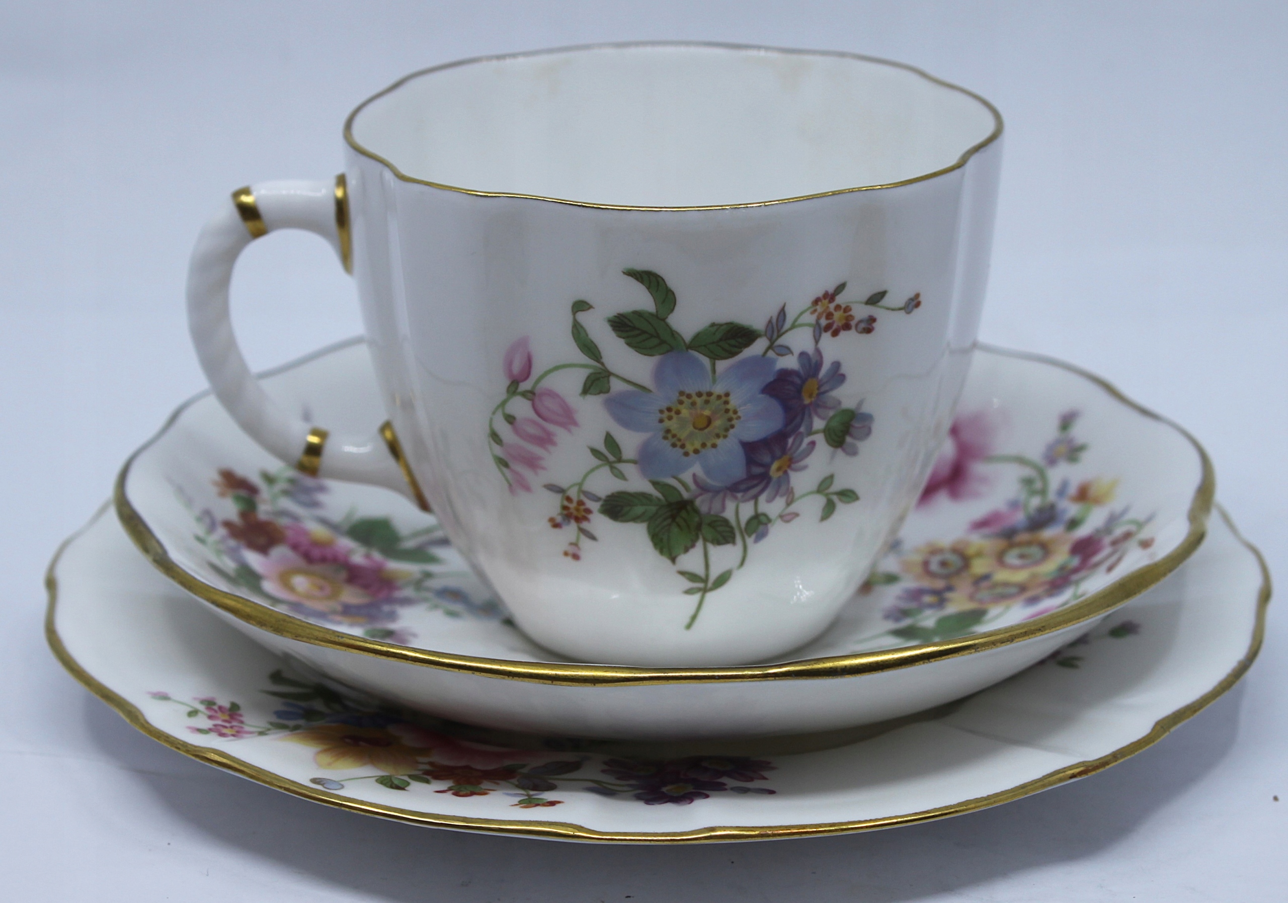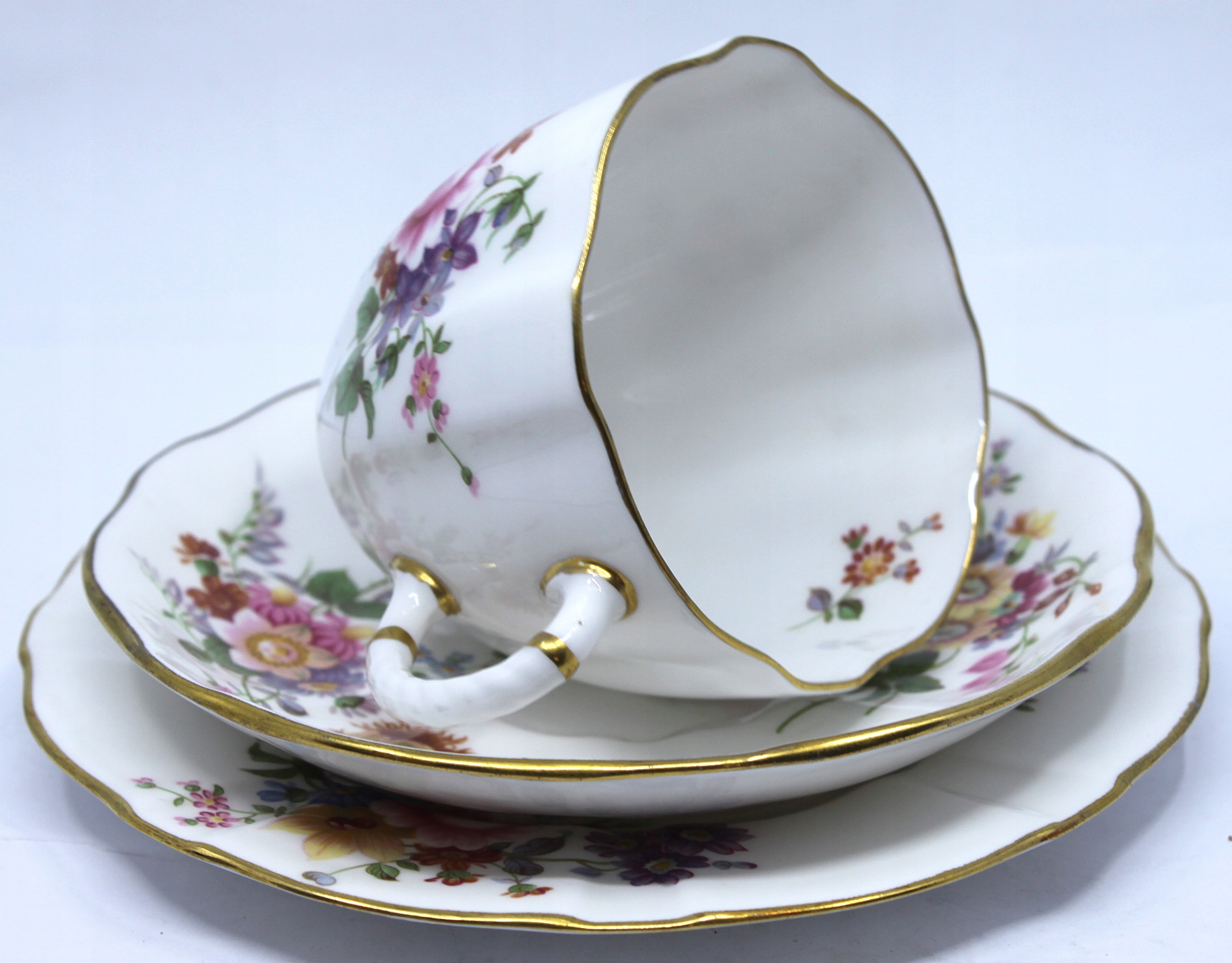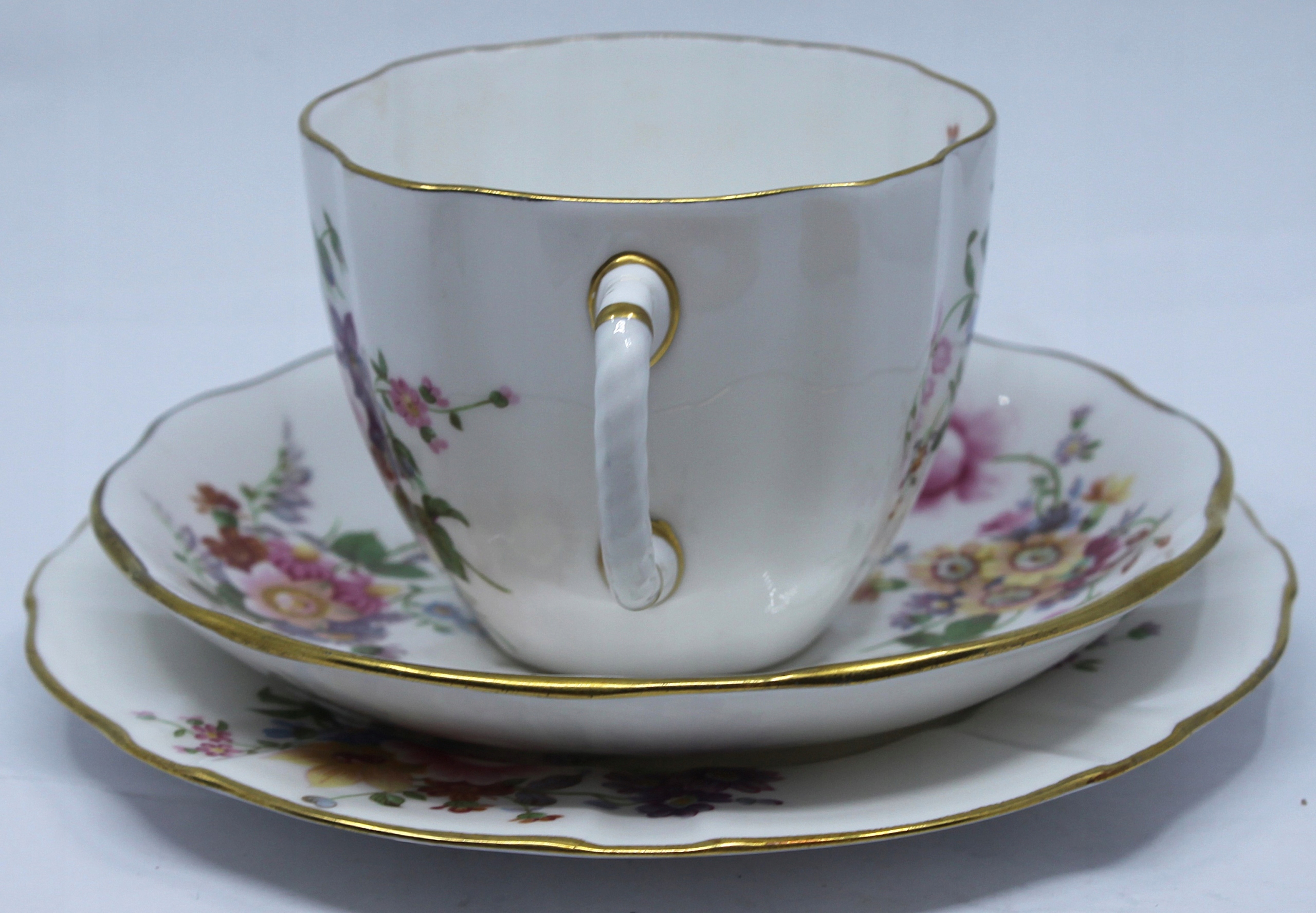 Чашка с блюдцом и тарелкой из королевского костяного фарфора, отделанной 22 -каратным золотом, рисунком сидения