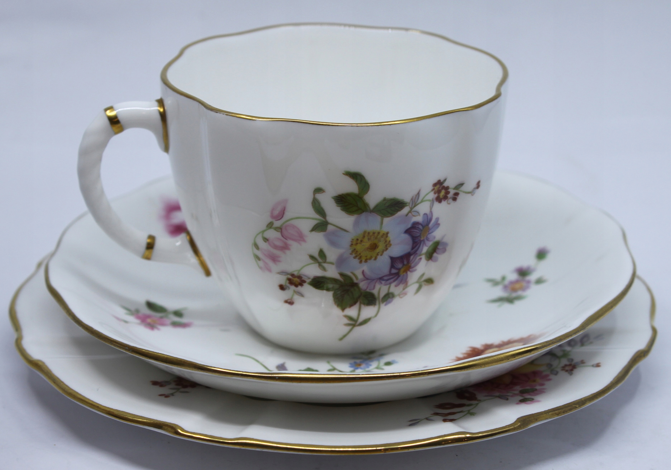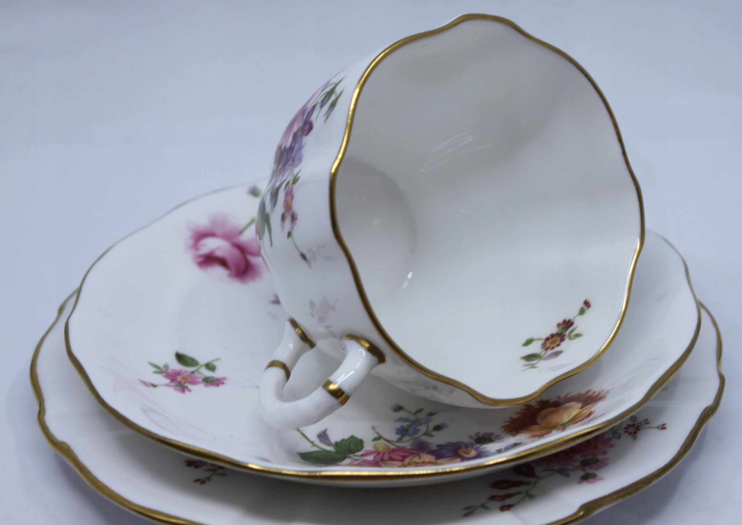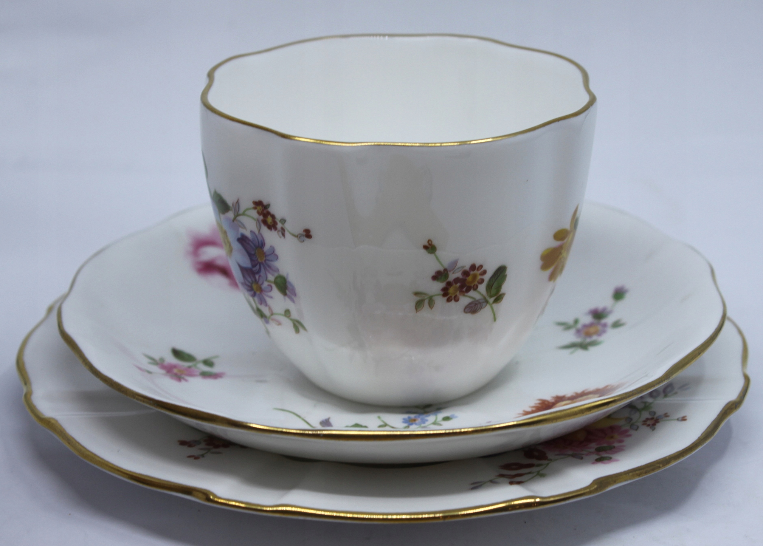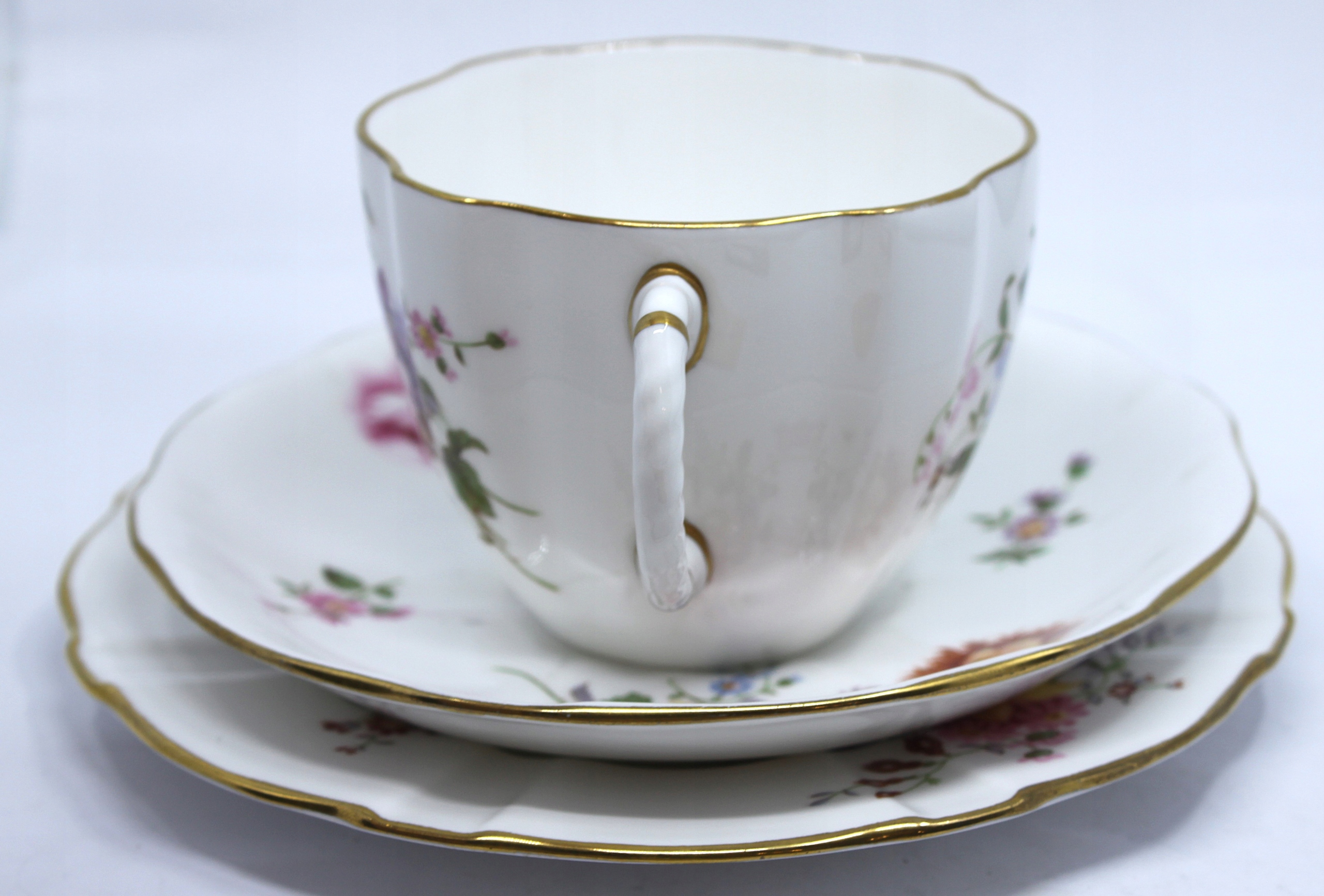 Чашка с блюдцом и тарелкой из королевского костяного фарфора, отделанной 22 -каратным золотом, рисунком сидения