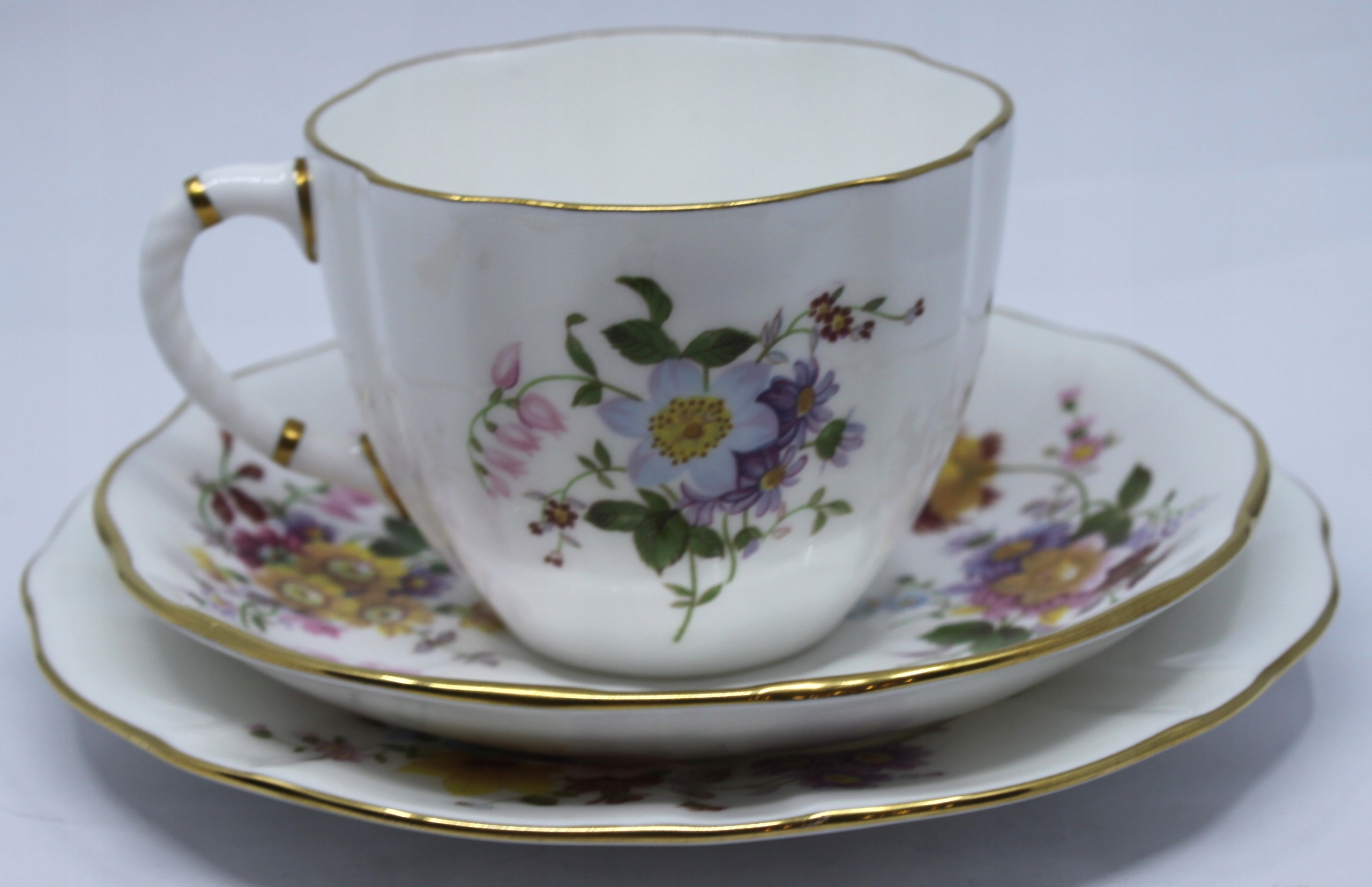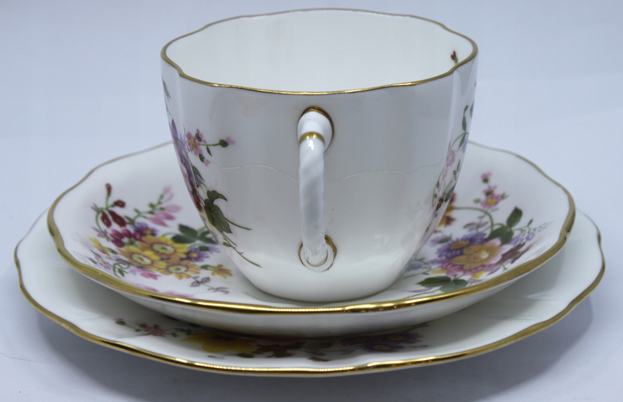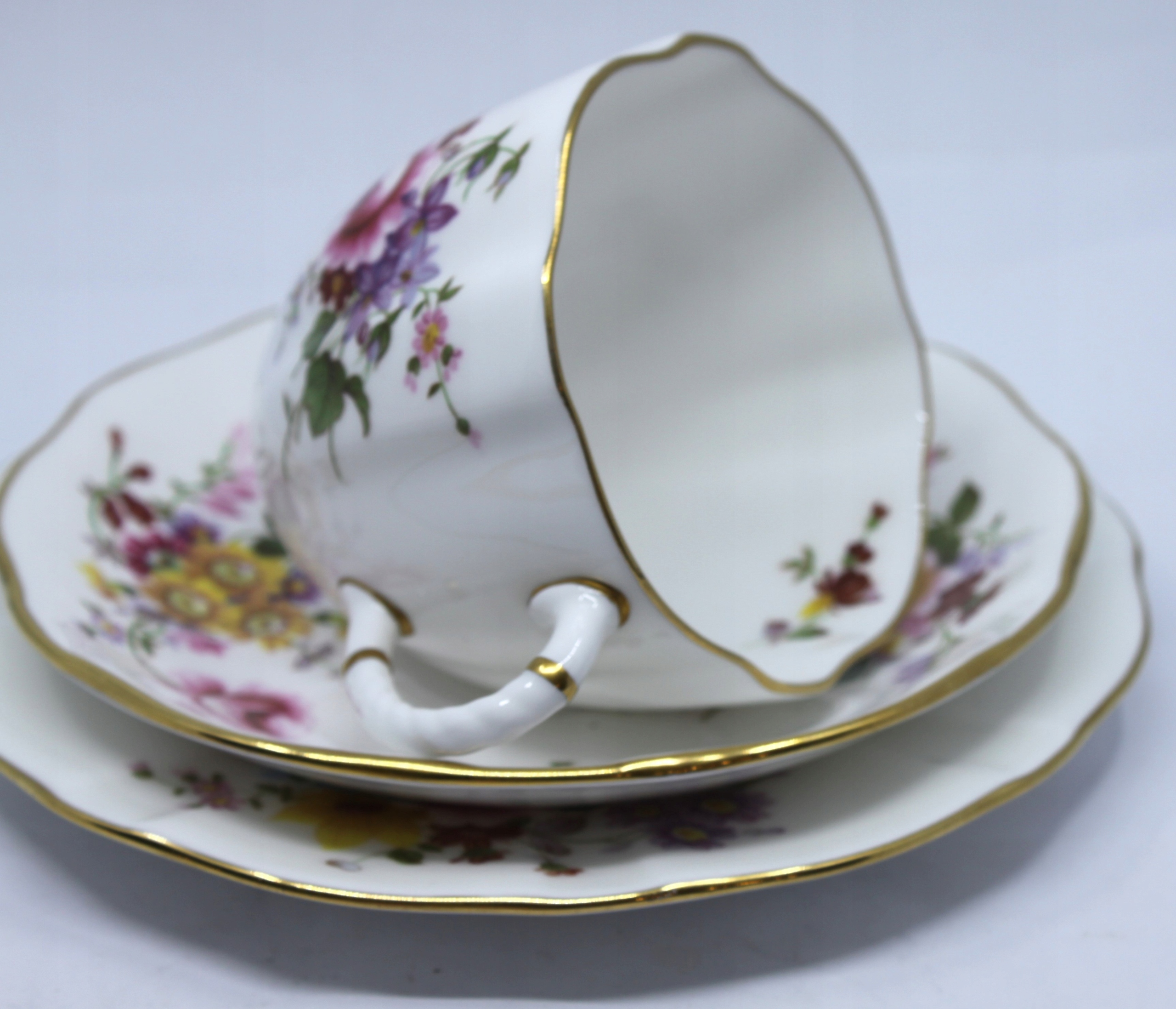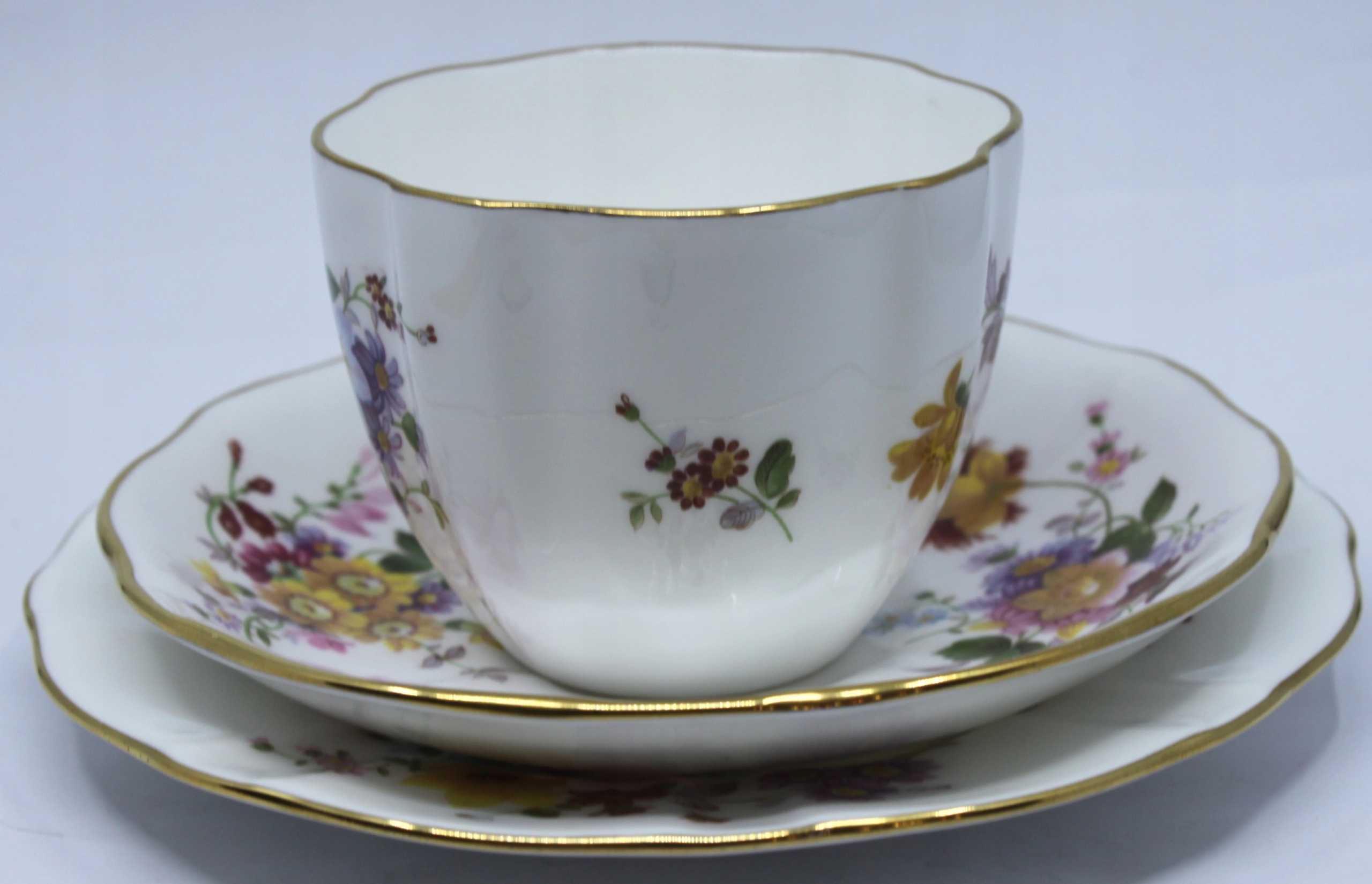 Чашка с блюдцом и тарелкой, сделанной из королевского костого фарфора, отделанной 22 каратным золотом, рисунком сидения