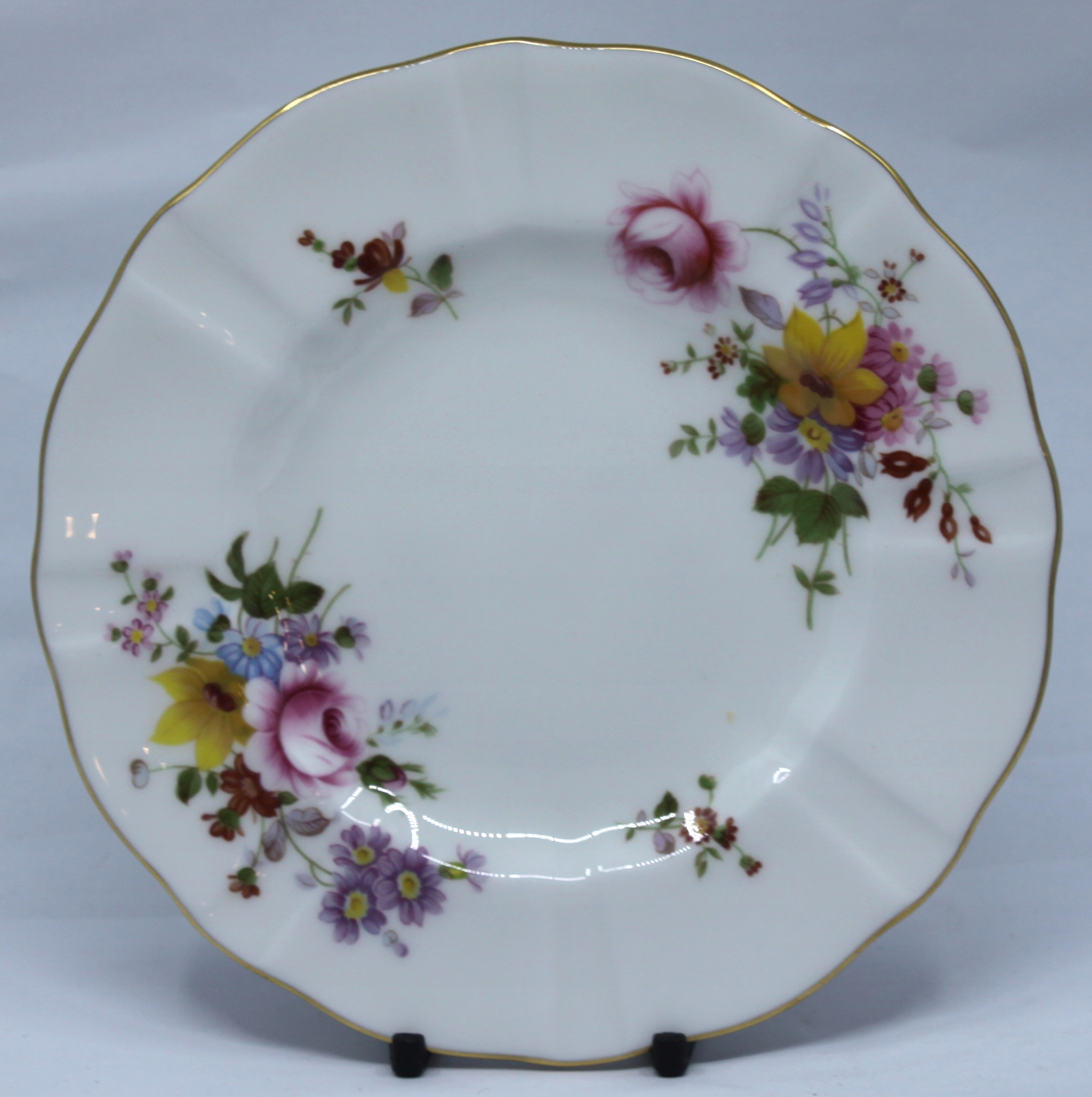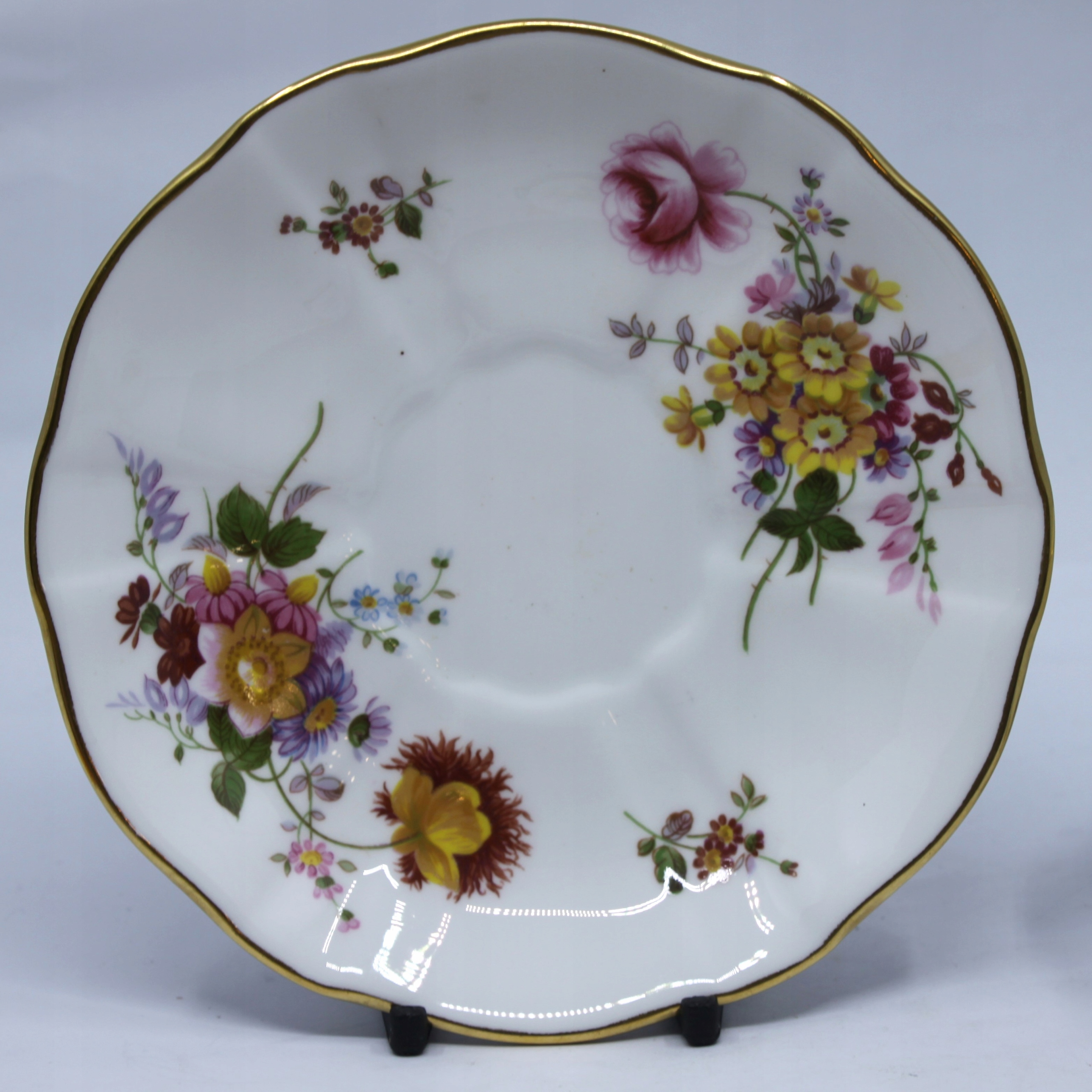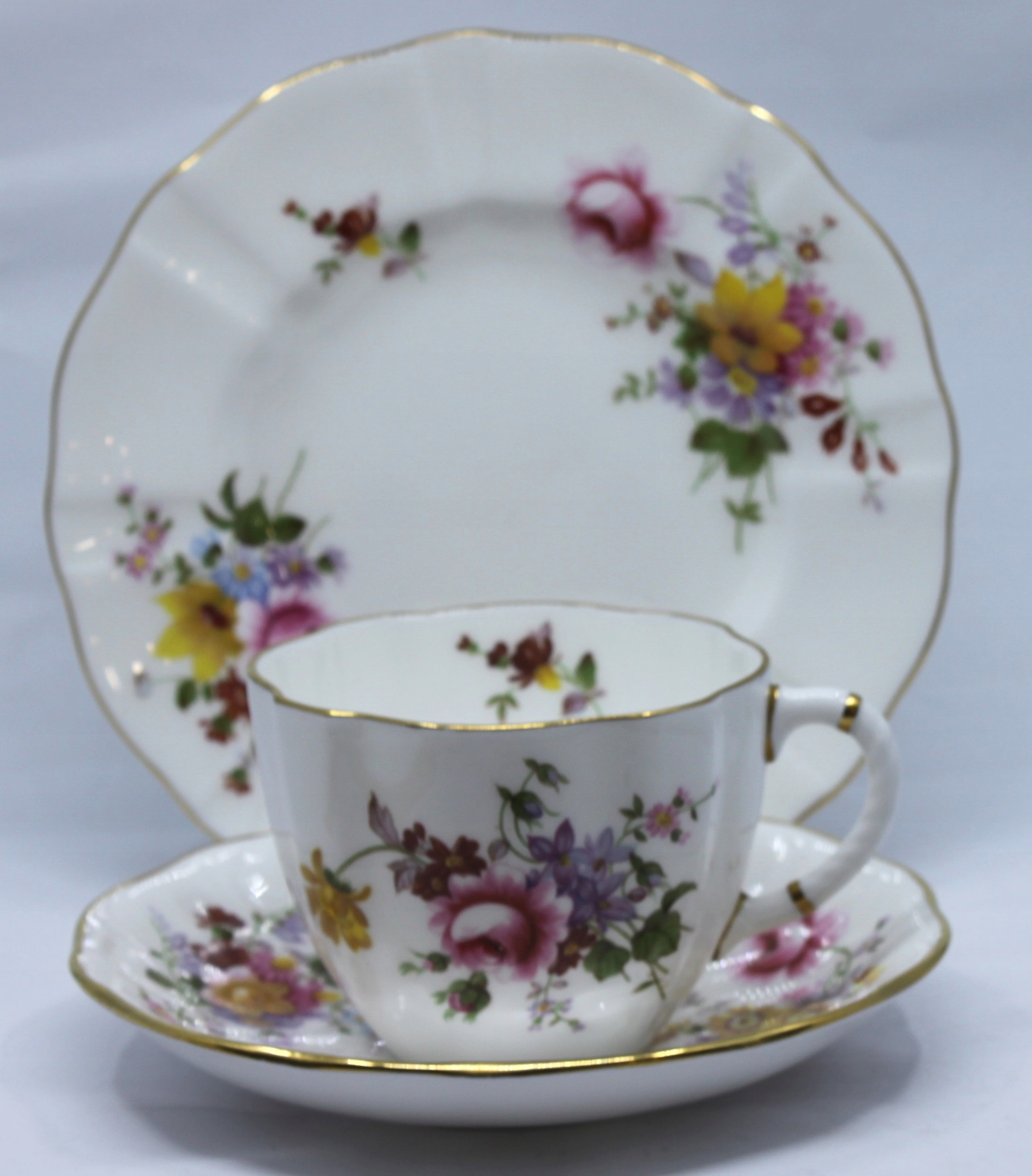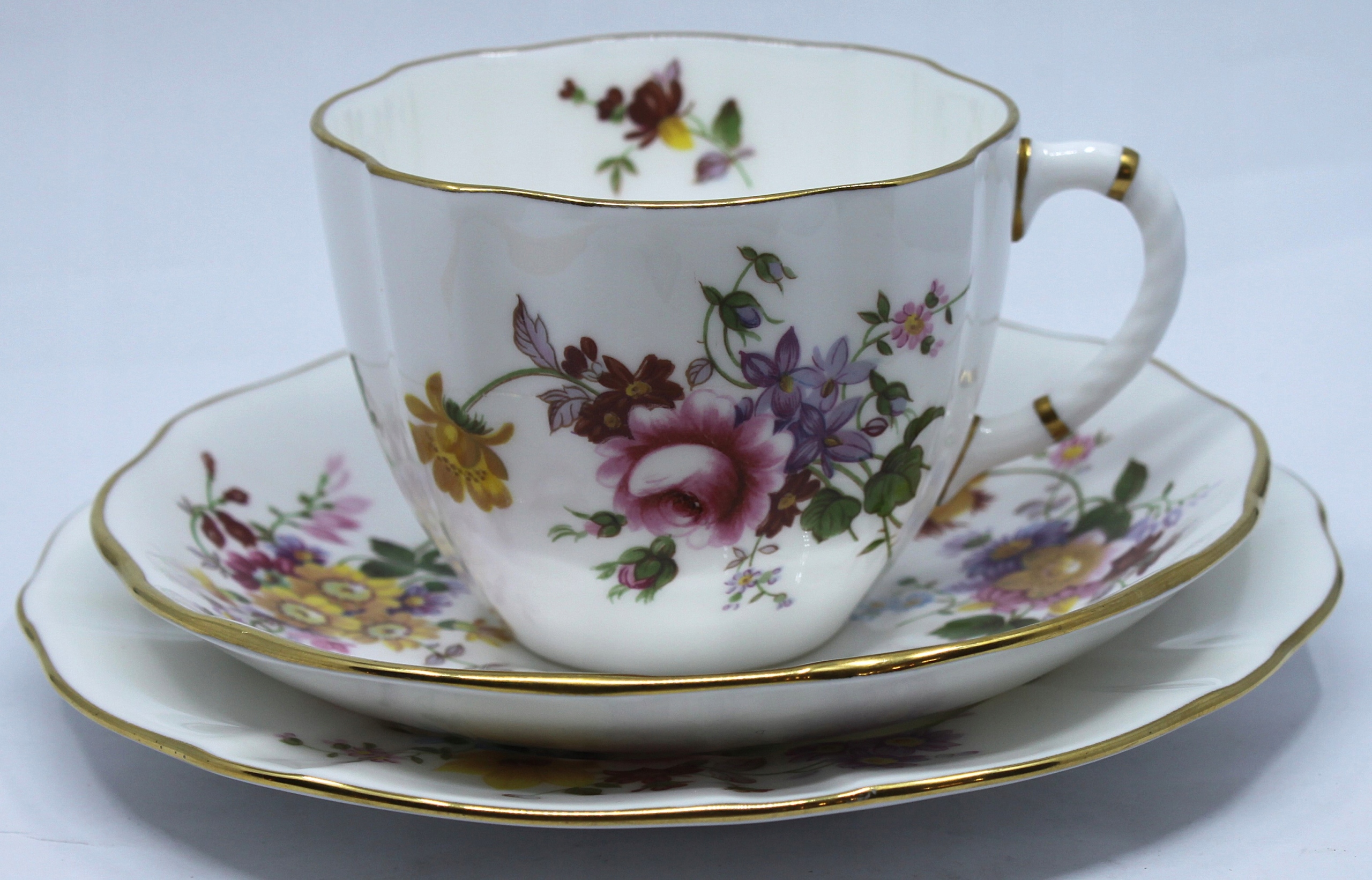 Чашка с блюдцом и тарелкой, сделанной из королевского костого фарфора, отделанной 22 каратным золотом, рисунком сидения