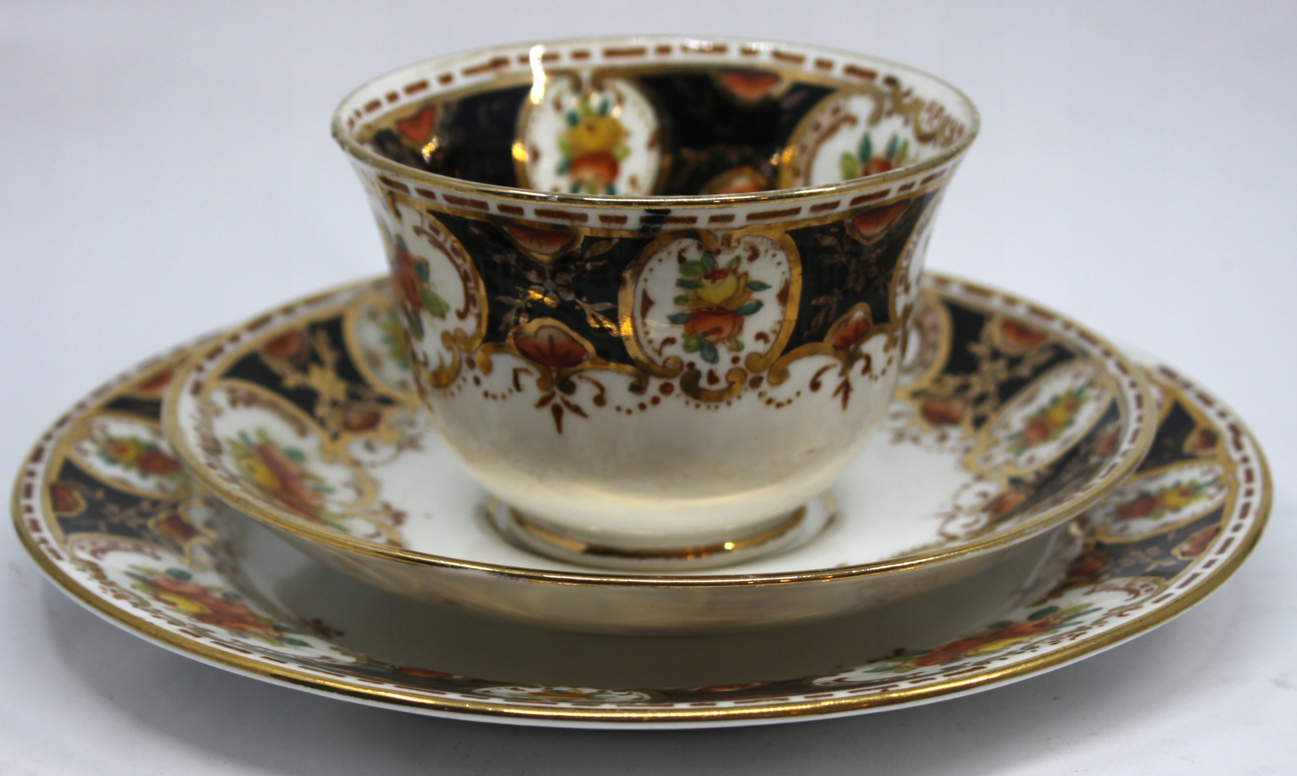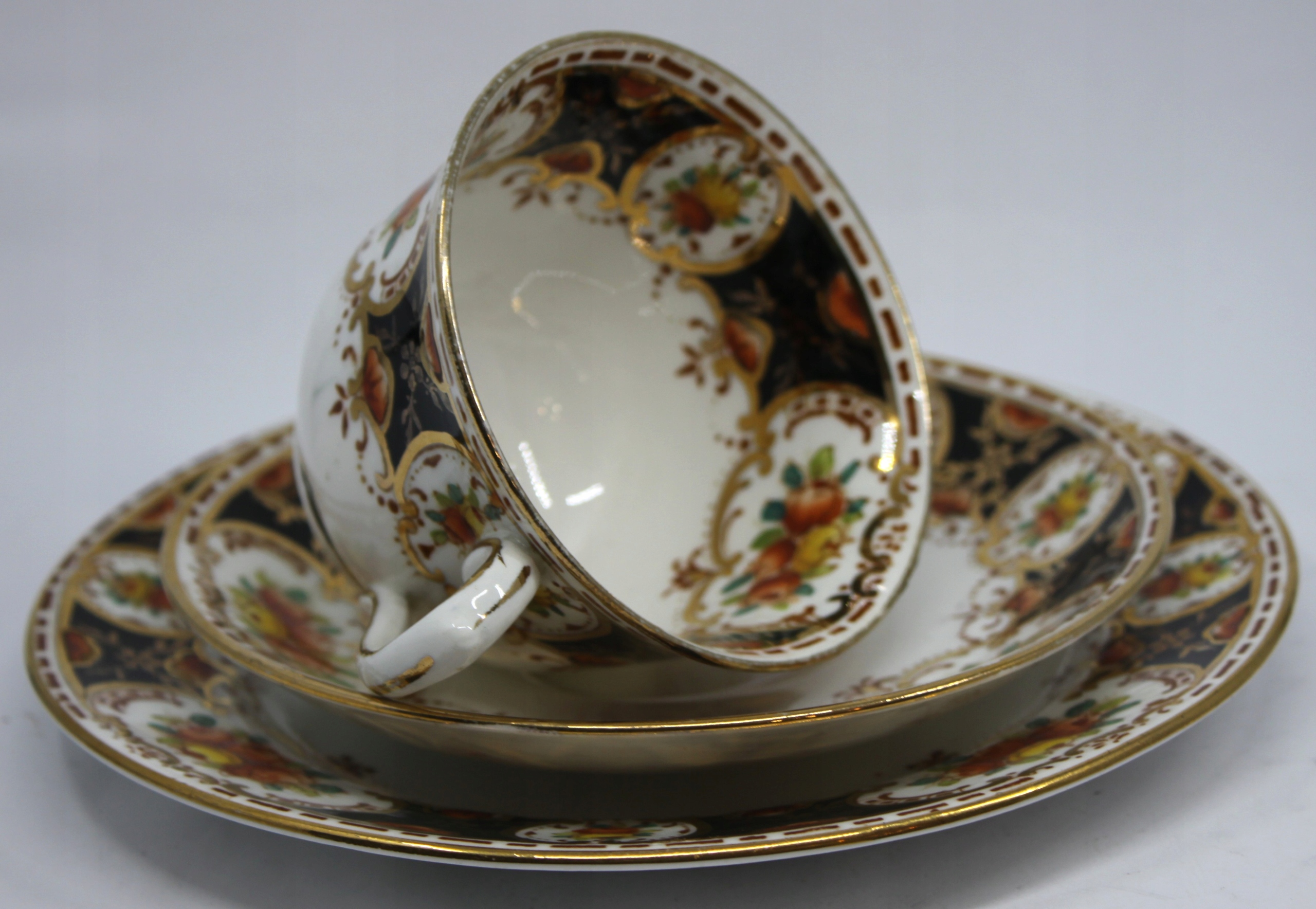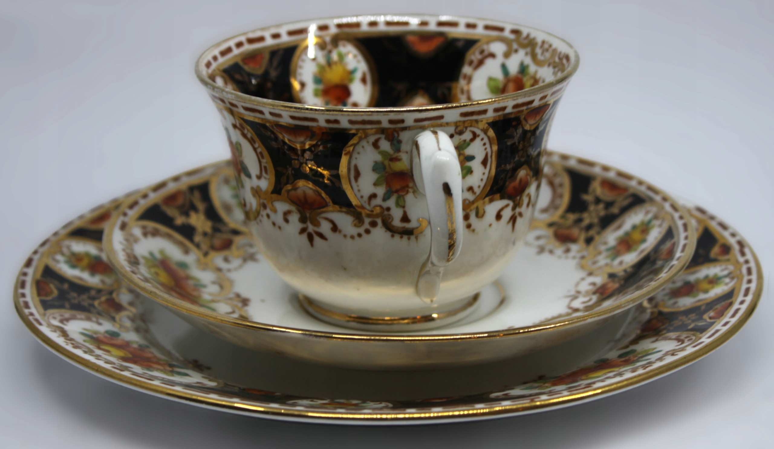 чашка с блюдцей и тарелкой из костей фарфора подписано