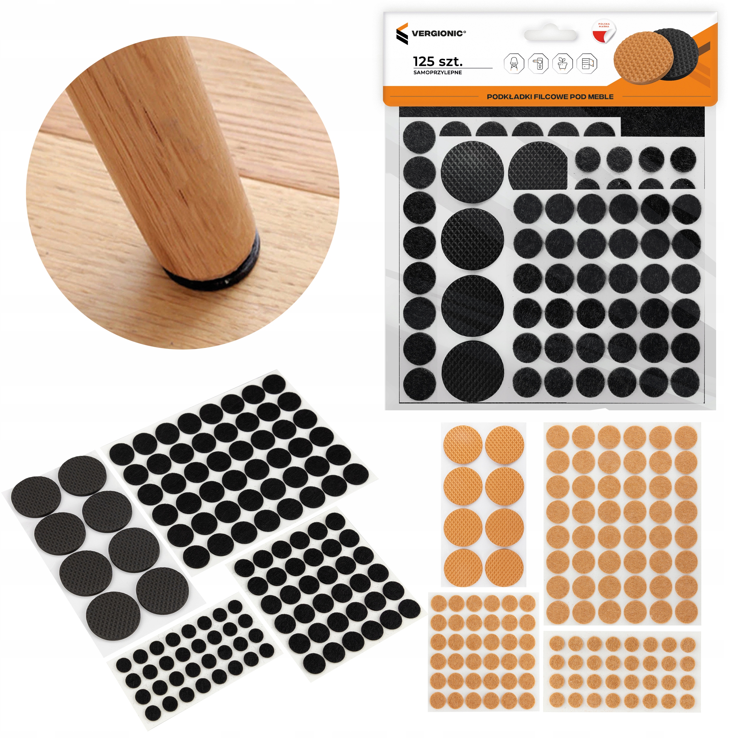 Накладки не требуют использования инструментов, так как снизу они снабжены прочным клеем. Просто снимите их со щитка и поместите в подходящее место под мебелью. Подушечки изготовлены из очень прочного фетра и пены. В наборе 125 штук разных размеров. Пожалуйста, сообщите нам при заказе, какой цвет вы выбираете — черный или коричневый. В противном случае будет отправлен случайный цвет. В комплект входят размеры: