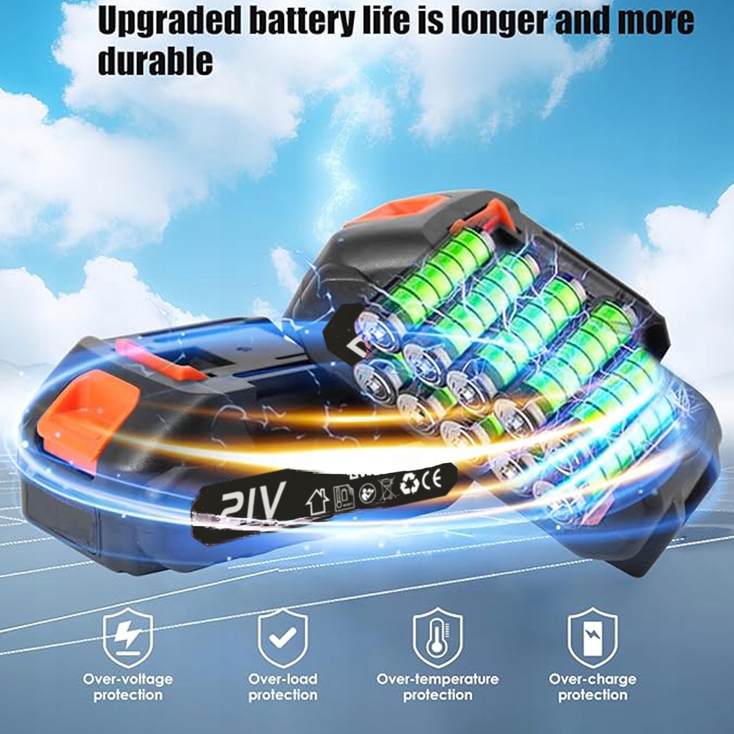 - Аккумулятор: литиевая батарея 21 В, 2000 мАч.