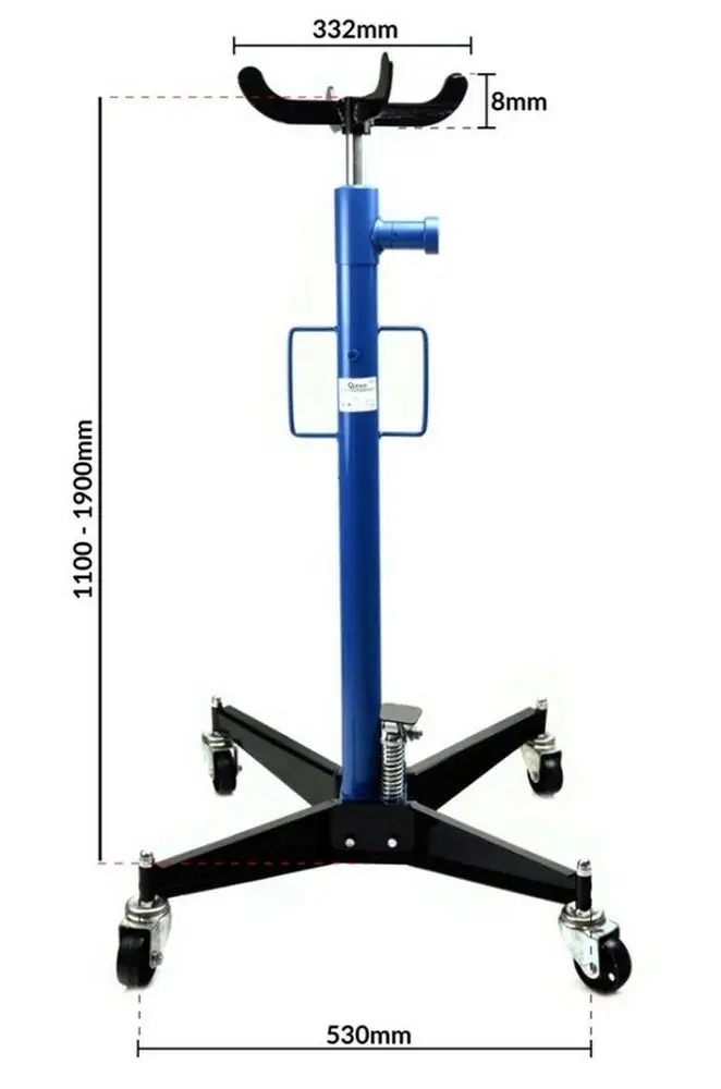 Домкрат для подъема коробки передач или двигателя. Подъемник оснащен четырьмя самовыравнивающимися колесами, обеспечивающими легкое и стабильное перемещение. Устройство используется в мастерских, гаражах или там, где при работе требуется большая грузоподъемность.