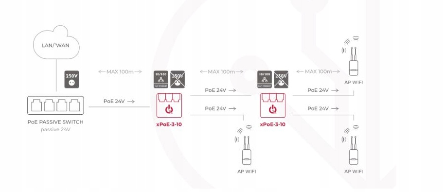 xPoE-3-10 был разработан как расширитель (повторитель) сетей LAN и источника питания PoE< /б> . Регенерирует сетевой сигнал и передает питаниеPoE на выбранные выходы. Чаще всего используется как «усилитель» для расширения сети на участках длиной более 100 м. Кроме того, он идеален в качестве «активного сплиттера» в ситуациях, когда нам нужно подключить несколько PoE-приемников (например, несколько IP-камер) к одному кабелю или когда нам нужно создать дополнительную ветвь сети.