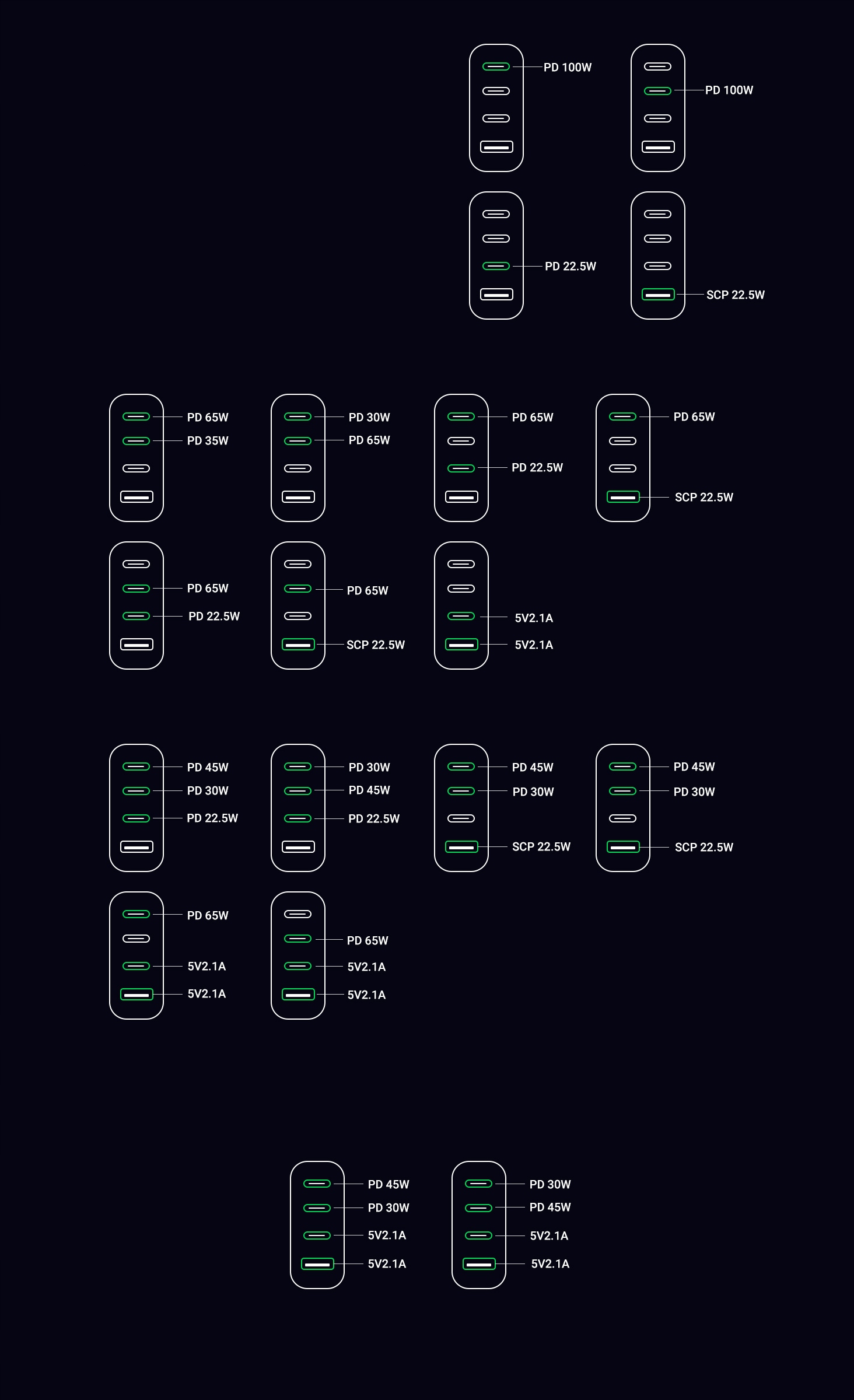 - USB-A: SCP/QC3.0/FCP/AFC/5V2.4A/BC1.2