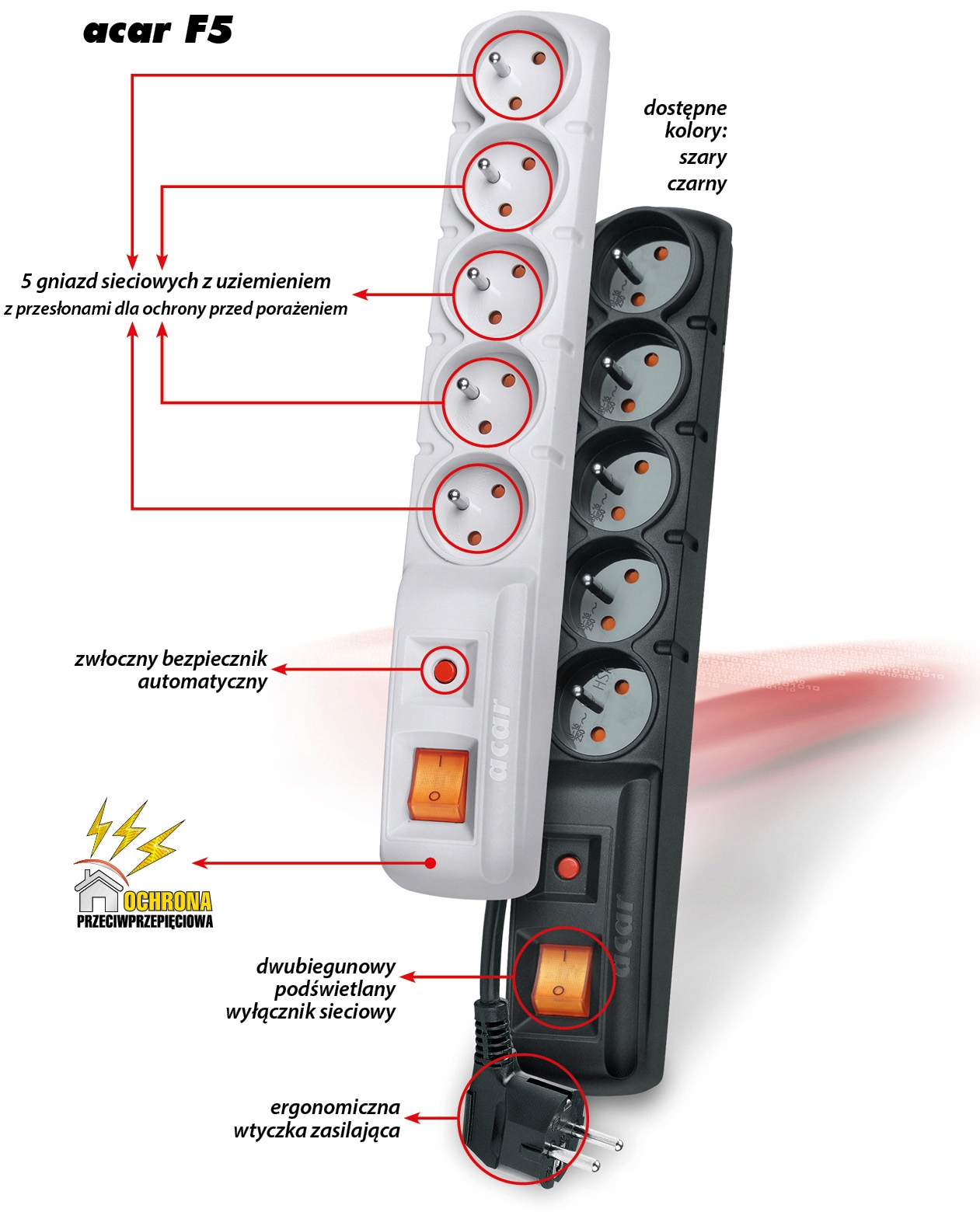 acar F5 — самое популярное охранное устройство из семейства acar-AXON. При длине менее 33 см он оснащен пятью розетками с заземлением. Этого объема достаточно для большинства приложений, а его относительно небольшой размер позволяет легко разместить его даже на столе. Используемый автоматический предохранитель позволяет назвать его практически необслуживаемым. Его высокая эффективность делает его основным устройством безопасности, необходимым в любом месте. Монтажные кронштейны можно приобрести у вашего дистрибьютора дополнительно.