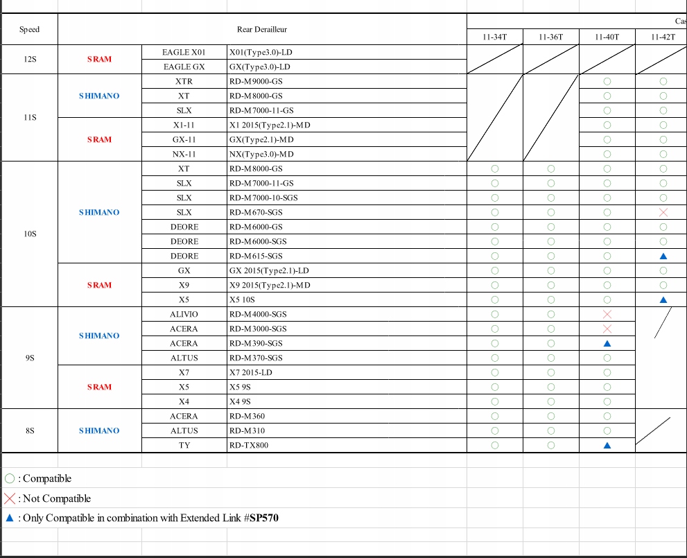 Удлинитель позволяет заднему переключателю («обычному») работать с кассетами 11–40, 11–42 или 11–46. Таблица совместимости на последней фотографии вверху.