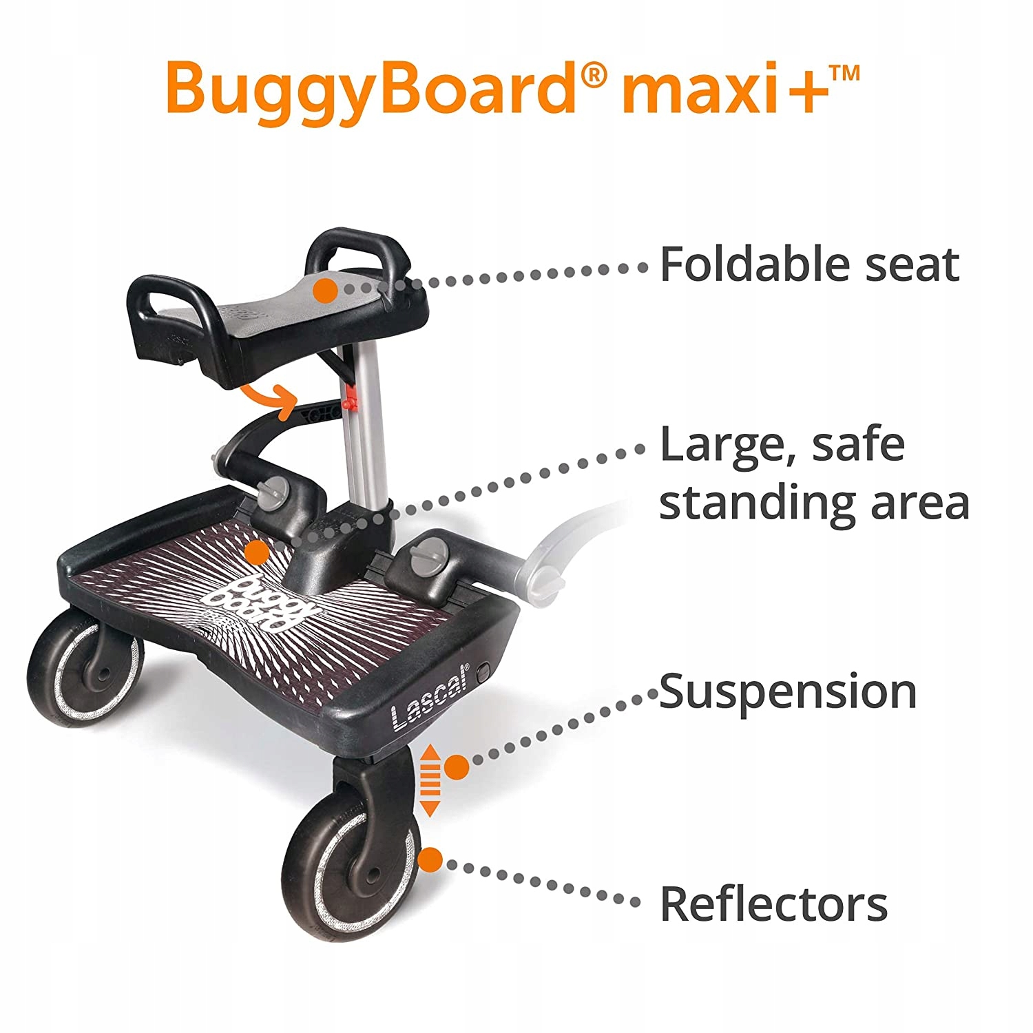 Lascal Buggy® хорошо продуман, универсален и удобен в использовании, легко адаптируется к коляске или багги и предлагает уставшим маленьким детям безопасную и практичную поездку. Благодаря продуманной системе Lascal Easy-Fit вы можете прикрепить доску практически к любой одинарной или двойной коляске. К ним относятся коляски, трехколесные велосипеды, системы для путешествий, коляски и детские коляски.