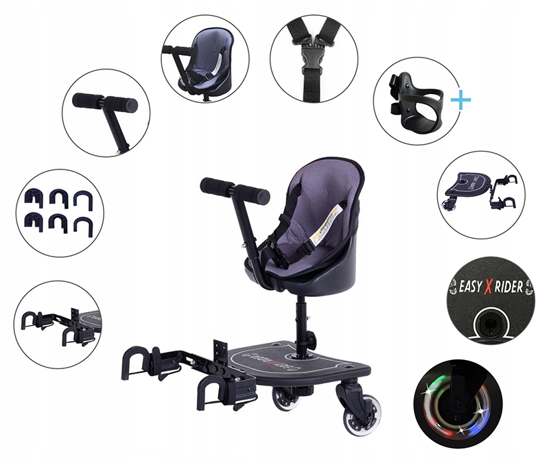 Easy X Rider v1 — это инновационная добавка 2-в-1, позволяя как сидеть, так и стоять. Благодаря универсальному жесткому креплению он легко адаптируется к большинству моделей колясок, устанавливаясь на нижнюю заднюю балку, где обычно расположена тормозная ножка.