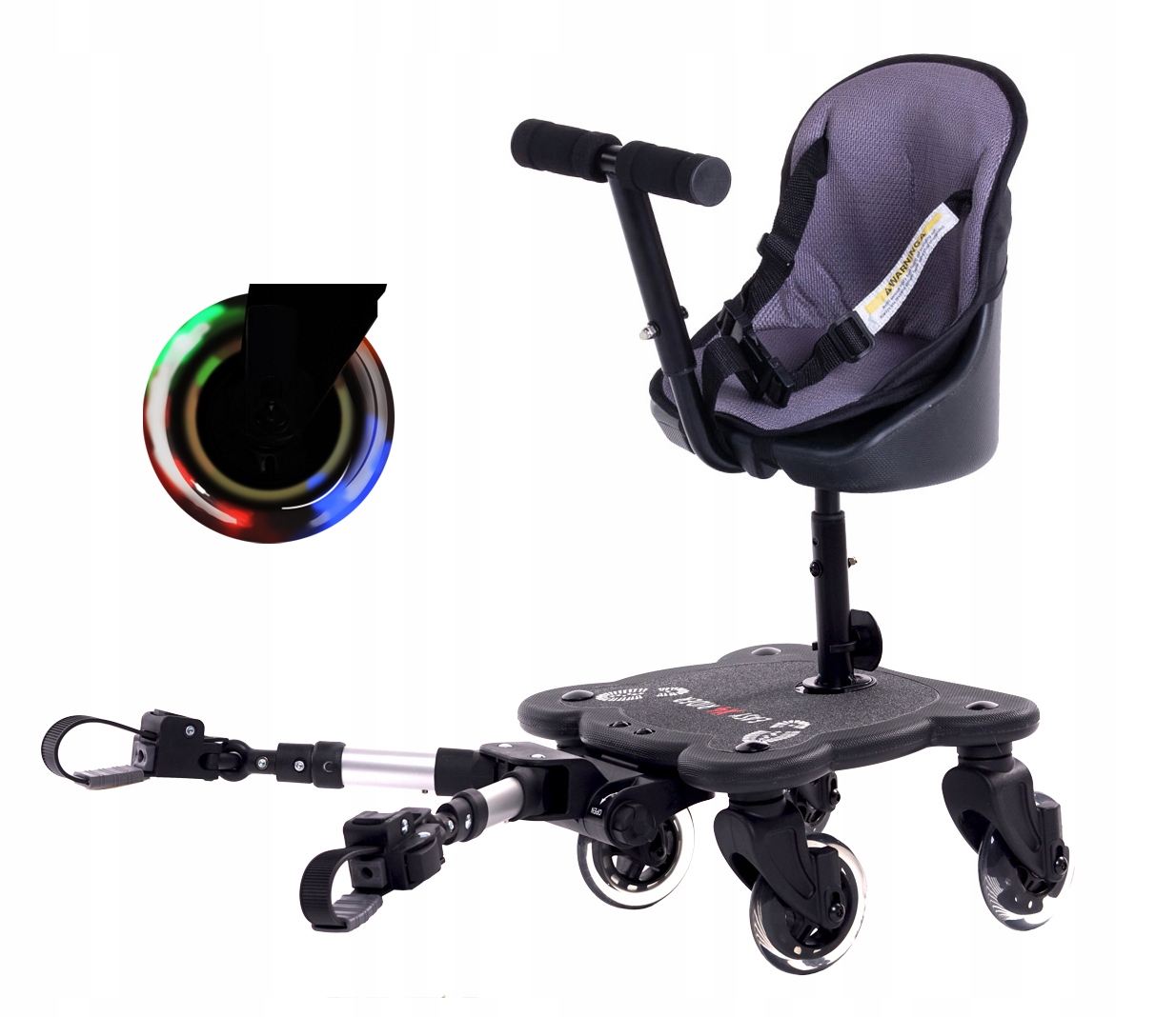 Easy Благодаря универсальной телескопической раме и гибкому креплению подходит практически ко всем моделям колясок, как зонтам, так и коляскам 2-в-1 и 3-в-1. Easy X Rider крепится на вертикальных балках, идущих от задних колес коляски. Состоит из: комфортного сиденья, с 3-точечными ремнями безопасности, ручки, серых мягких подушек, с противоскользящей платформой, светящимися мягкими колесами (2 задних с подсветкой), переходниками и ремнем, < /b >благодаря которому мы можем поднять все это.