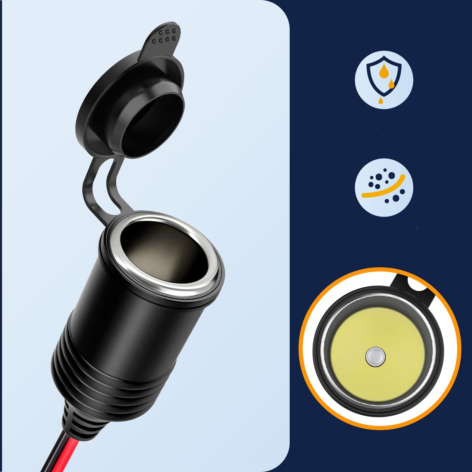 - 【Водонепроницаемый колпачок】 Вилка прикуривателя для гнездового кабеля с защитным колпачком для защиты от воды и пыли, который защищает розетку 12 В от непогоды.