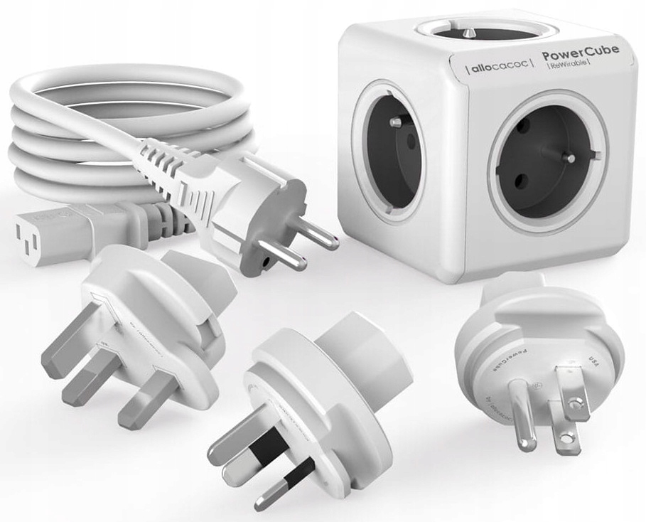 Удлинитель со сменным предохранителем. PowerCube Rewirable позволяет одновременно питать пять электронных устройств. Кроме того, в комплект входят три дорожные вилки: (США, Великобритания, Австралия) и кабель с вилкой IEC EU.