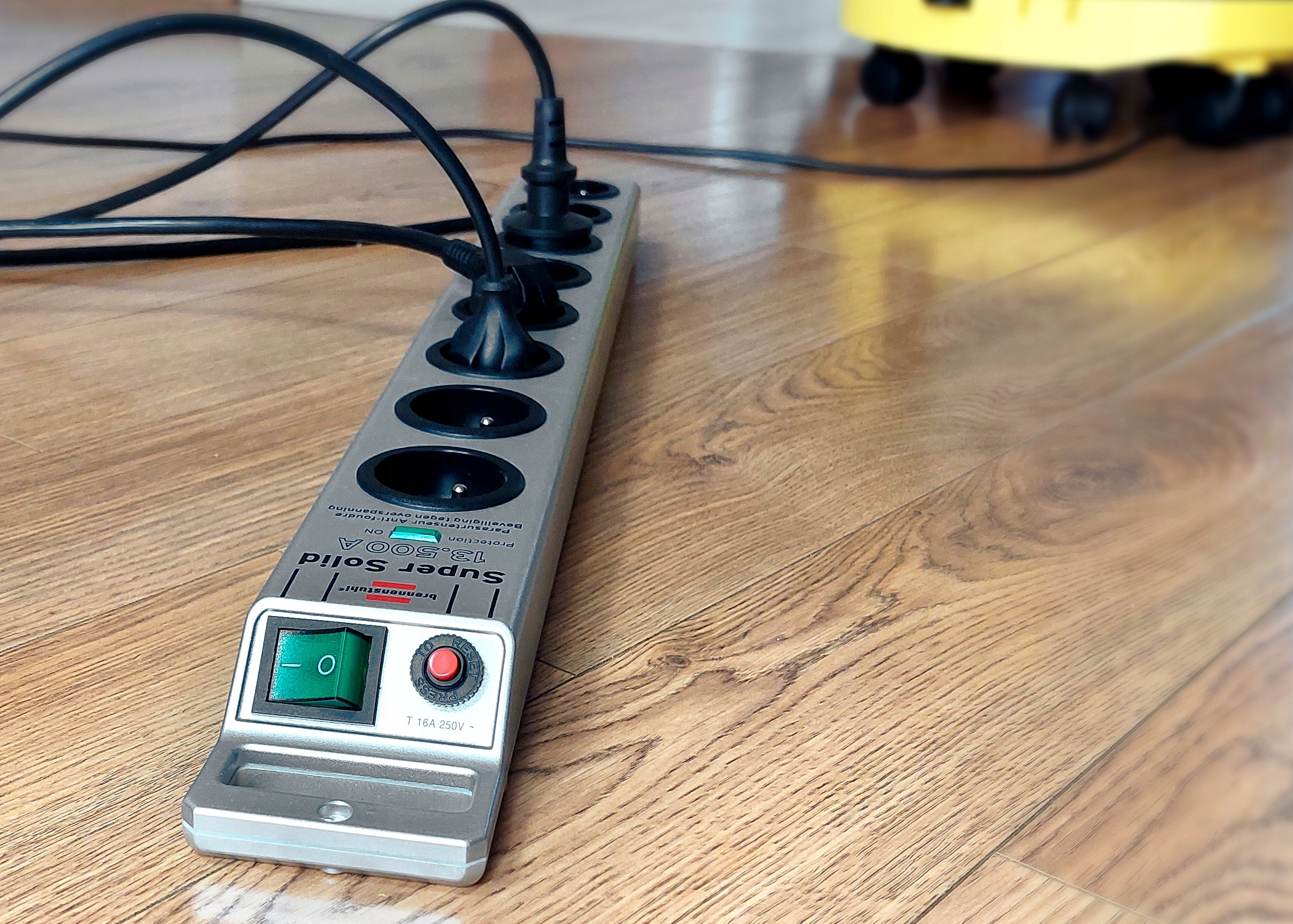 Brennenstuhl Super-Solid — это высококачественный удлинитель с 8 розетками и очень длинным кабелем 2,5 м (H05VV- F 3G1 ,5) автоматический выключатель на ток 16 А и повышенной защитой контактов. Удлинитель оснащен переключателем с подсветкой из ударопрочного поликарбоната.