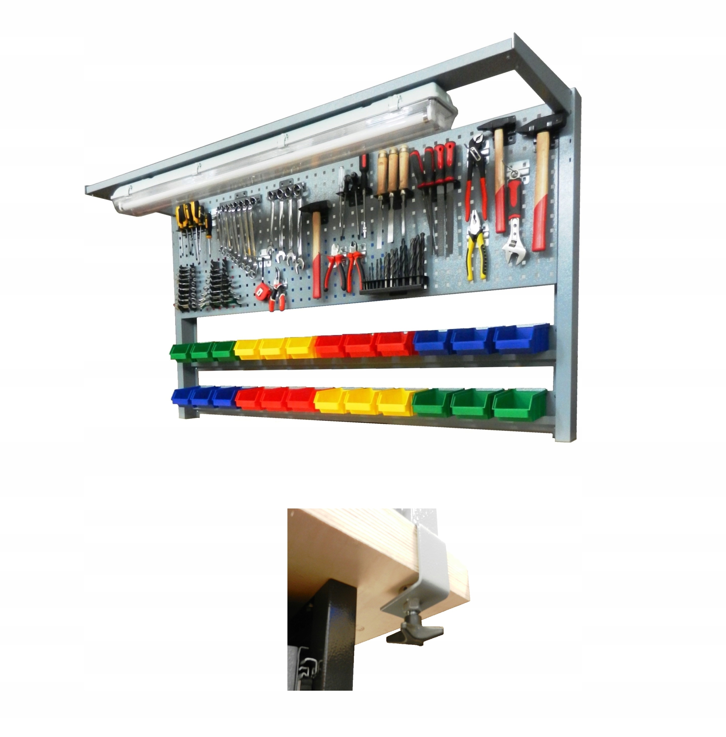 - оснащен перфорированной стенкой (квадратная перфорация) и двумя кронштейнами для подвешивания контейнеров для мелких предметов, каждый кронштейн имеет 12 прорезей для контейнеров ,