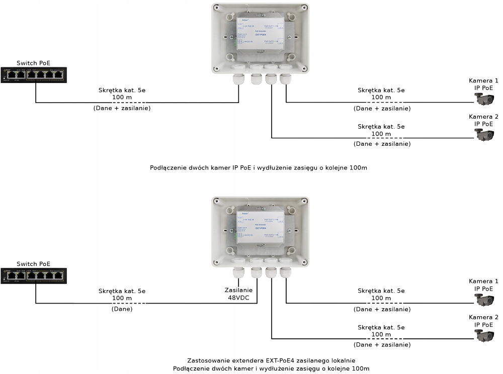 - Применение: Увеличивает дальность передачи данных Ethernet и питания PoE еще на 100м. Позволяет подключить две IP-камеры PoE с помощью одного кабеля.