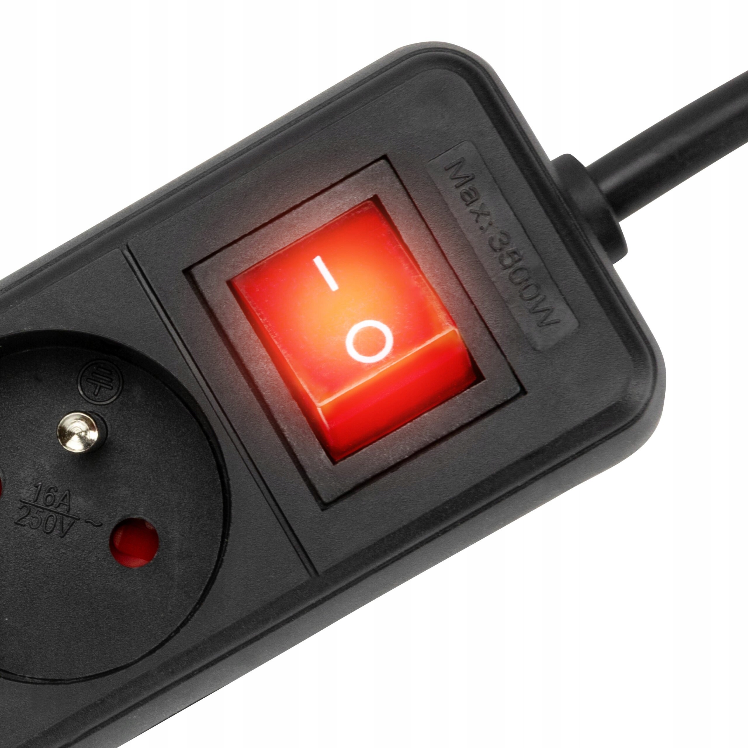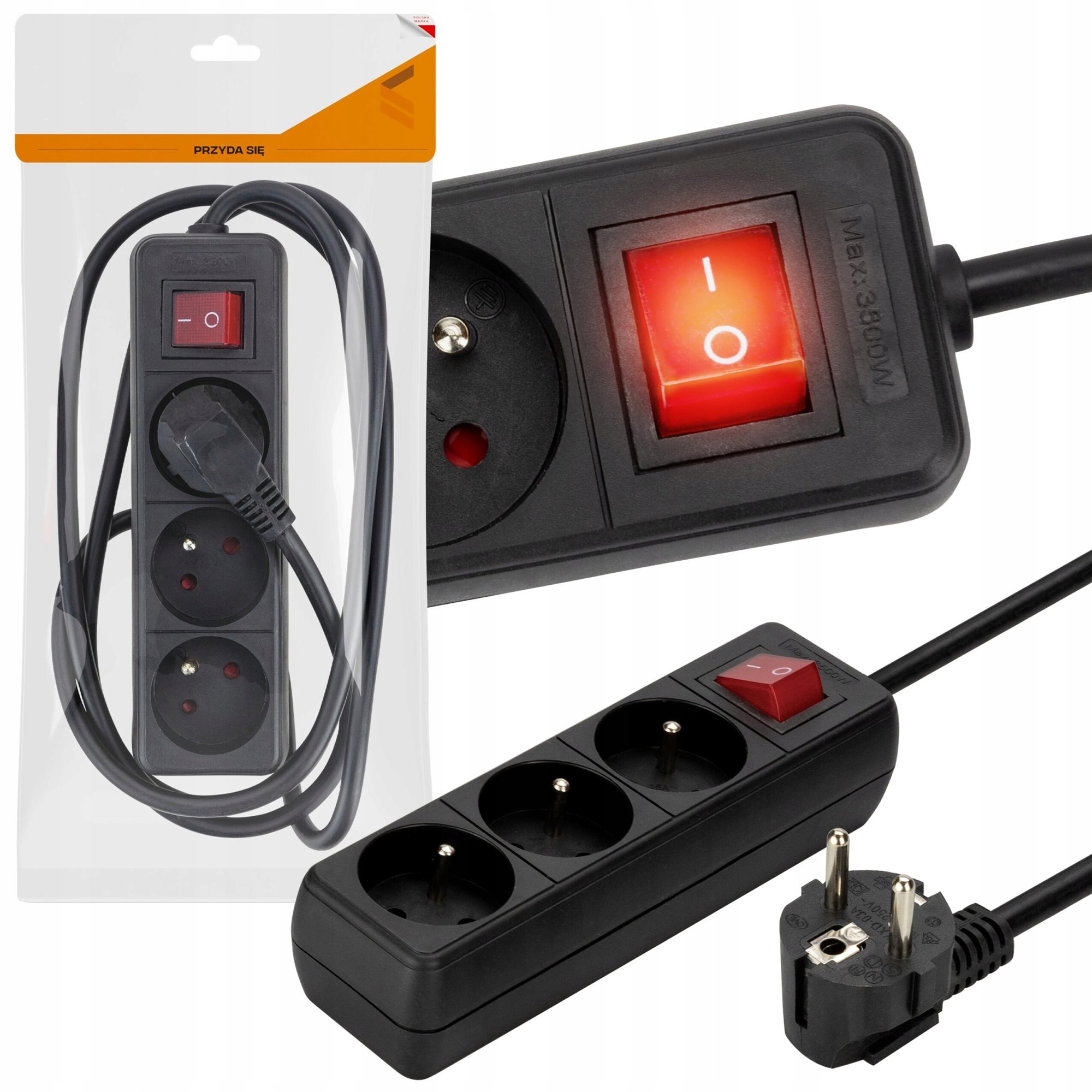 Черный удлинитель с тремя розетками с максимальной потребляемой мощностью 3500Вт. Благодаря кабелю длиной 1,8 м можно подключать устройства далеко от розетки.