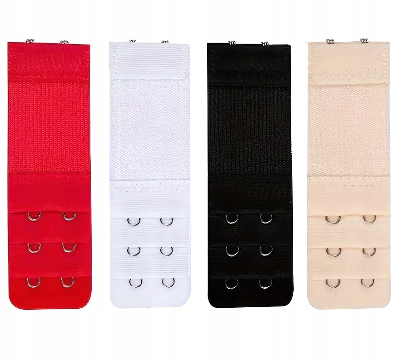 Практичный набор из 4-х удлинителей бюстгальтера универсальных цветов: красного, белого, бежевого и черного. Идеально подходит для регулировки окружности бюстгальтера для большего комфорта при ношении. Каждое удлинение имеет 2 ряда крючков и резинку, что обеспечивает удобную посадку и устойчивость.