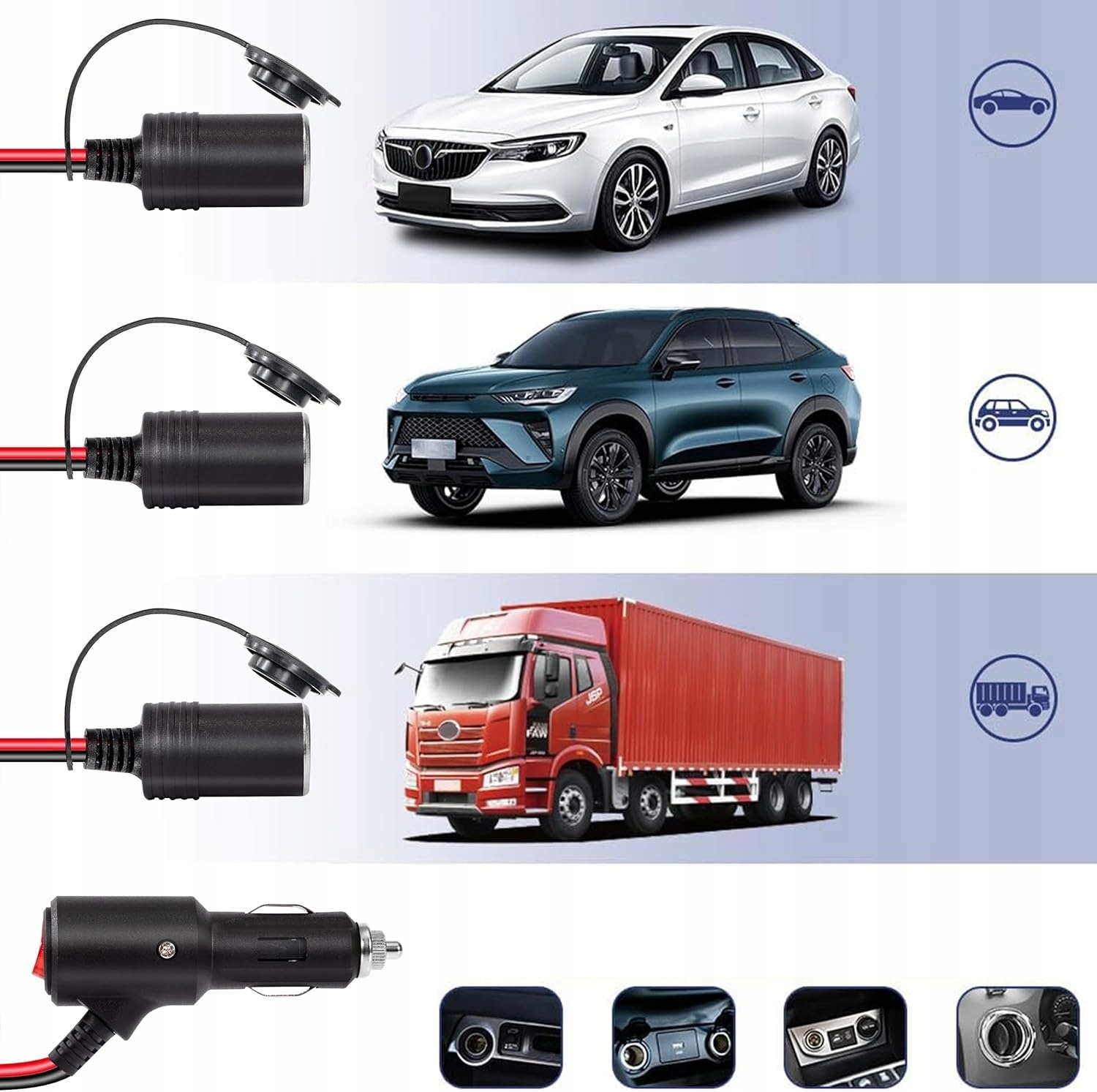 Широкое применение: Подходит для всех автомобильных устройств 12 В/24 В с вилкой прикуривателя, таких как накачивающие шины, автомобильные телевизоры, автомобильные холодильники, инверторы, очистители воздуха или другой автомобильный комплект.