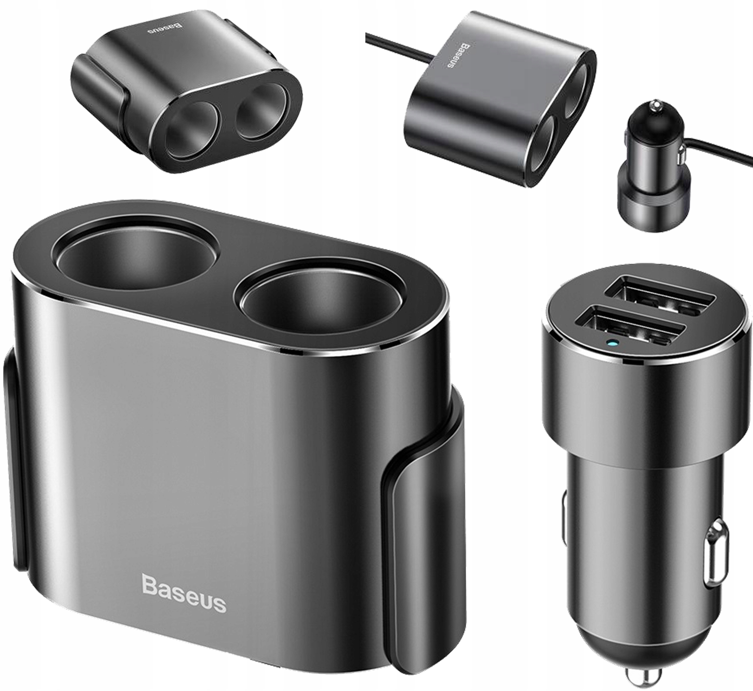 Качественное автомобильное зарядное устройство Baseus — гарантия быстрой и безопасной зарядки. Baseus создала зарядное устройство необычного дизайна с двумя дополнительными входами для прикуривателя. Для производства использован качественный металл. Благодаря небольшим размерам не отвлекает водителя.