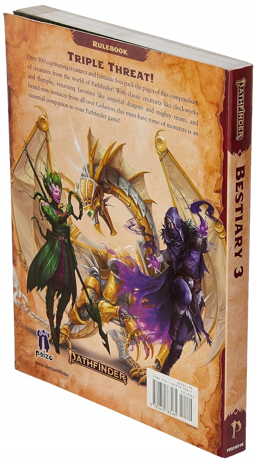 Эта 320-страничная прекрасно иллюстрированная книга правил в мягкой обложке, включающая более 300 классических и совершенно новых монстров, дополняет коллекцию существ, начатую в первых двух томах Бестиария Pathfinder. От классических существ, таких как часовой механизм и зубные феи, возвращающихся фаворитов, таких как имперские драконы и могучие титаны, до совершенно новых угроз, встречающихся по всему Голариону, этот обязательный фолиант монстров, созданный для того, чтобы бросить вызов персонажам любого уровня, станет незаменимым спутником вашей игры Pathfinder. !