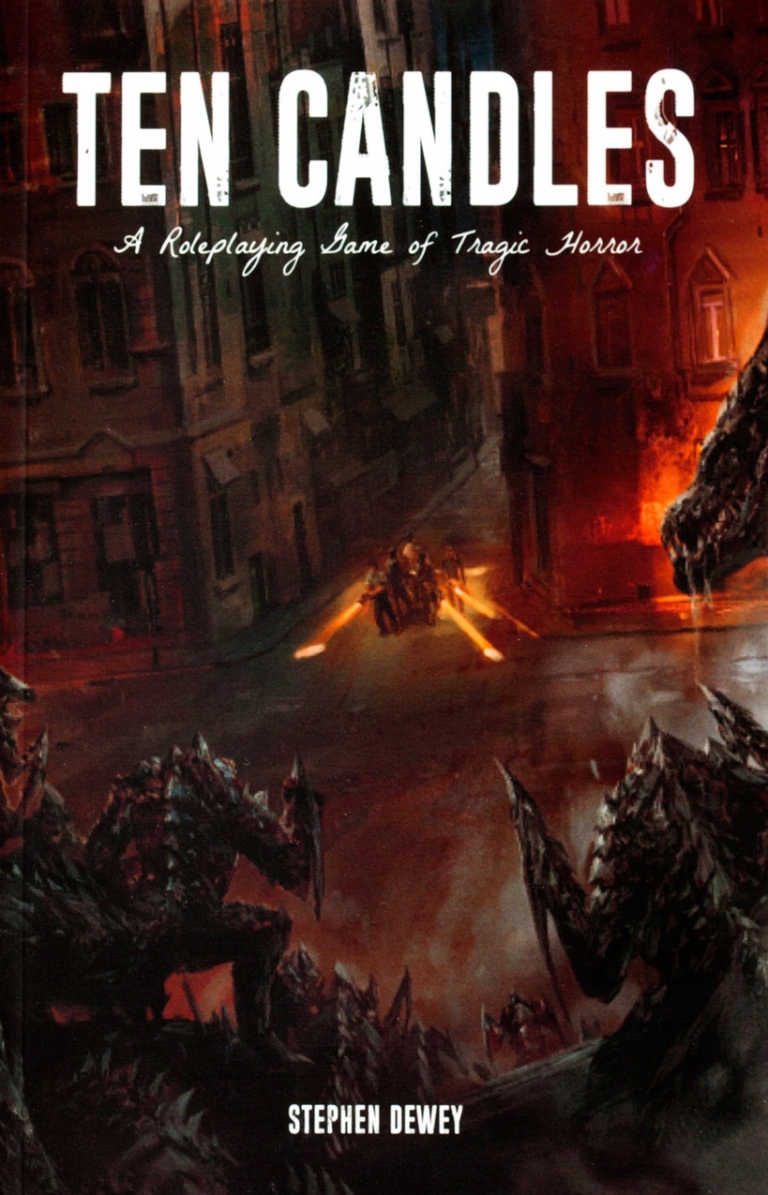 Ten Candles - это трагическая ролевая игра ужасов, взорванная вокруг кооперативного повествования. Он предназначен для одноразовых сессий (а не для продолжающихся кампаний) и может играть с любым количеством игроков и одним игровым мастером. Игра из десяти свечей длится 2-3 часа. Игроки играют роли выживших в середине солнечного апокалипсиса, проживая последние несколько часов жизни своего персонажа. Gamemaster контролирует их, необычные противники, которые преследуют прямо за краем света. Но это не история о монстрах. Это история о том, что счастлива в темноте. То, что происходит с теми, кто сражается с этим, ищет надежду внутри нее и неизбежно поглощается им.