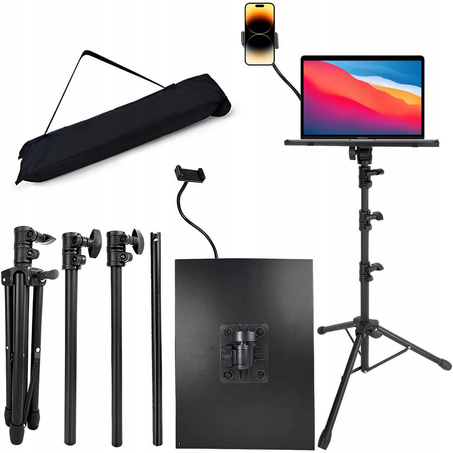 - В комплект входит: 1 штатив, 1 лоток + крепежные резинки, 1 телефон держатель, 1 сумка с ремнем