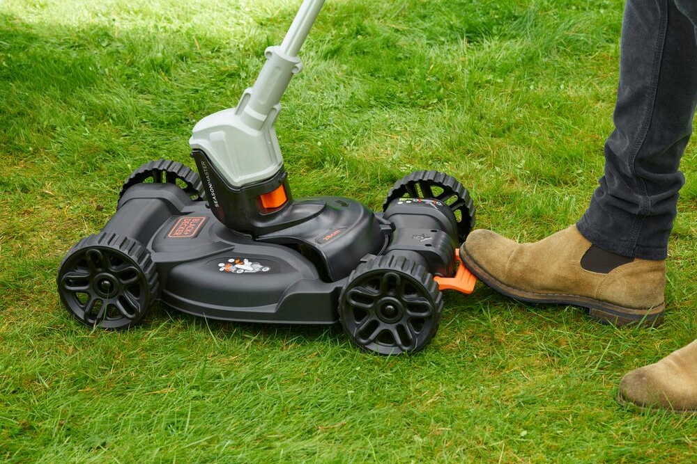 - Легкая база с колесами, позволяющая использовать струнную косилку в качестве стандартной газонокосилки - более легкая и комфортная стрижка небольших газонов