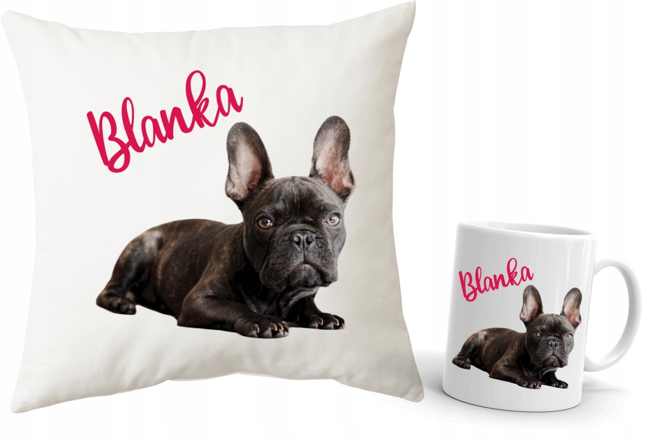 ПОДАРОЧНЫЙ НАБОР с ФРАНЦУЗСКИМ БУЛЬДОГОМ и именем: КРУЖКА + ПОДУШКА с наполнителем