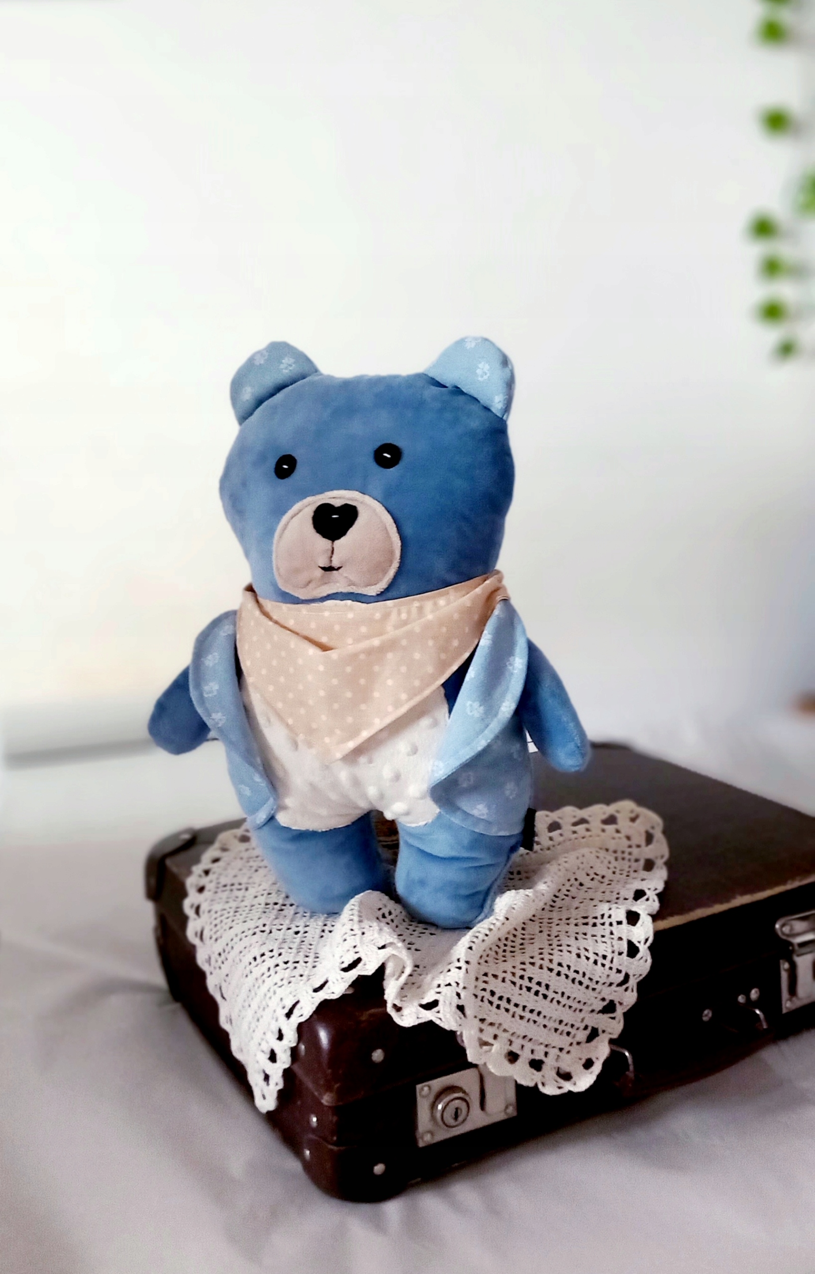 Мех плюшевого мишка был сделан из гладкого, невероятно приятного на ощущение муки. Эксет, стильный жилет и шарф из хлопка из сертифицированных материалов от польских производителей. Закрылки видимы спереди. Тедди -медвежьи не гладкие. Смайлик смайлик на рту из мультиварки!