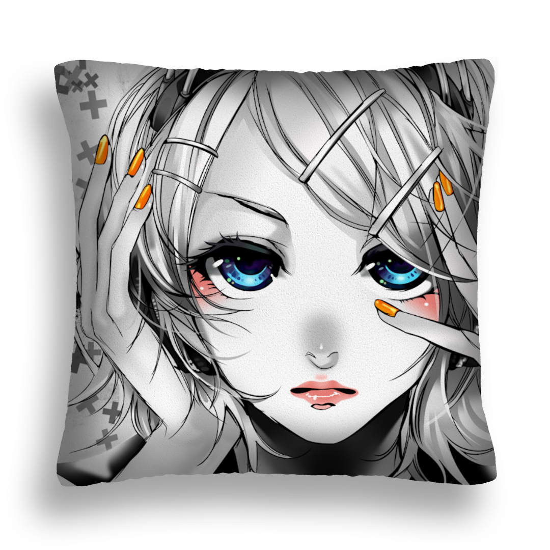 ПОДУШКА АНИМЕ 05 ЧЕРНОБЕЛОЕ ГОЛУБЫЕ ГЛАЗА ЛЕДИ ОРАНЖЕВЫЙ