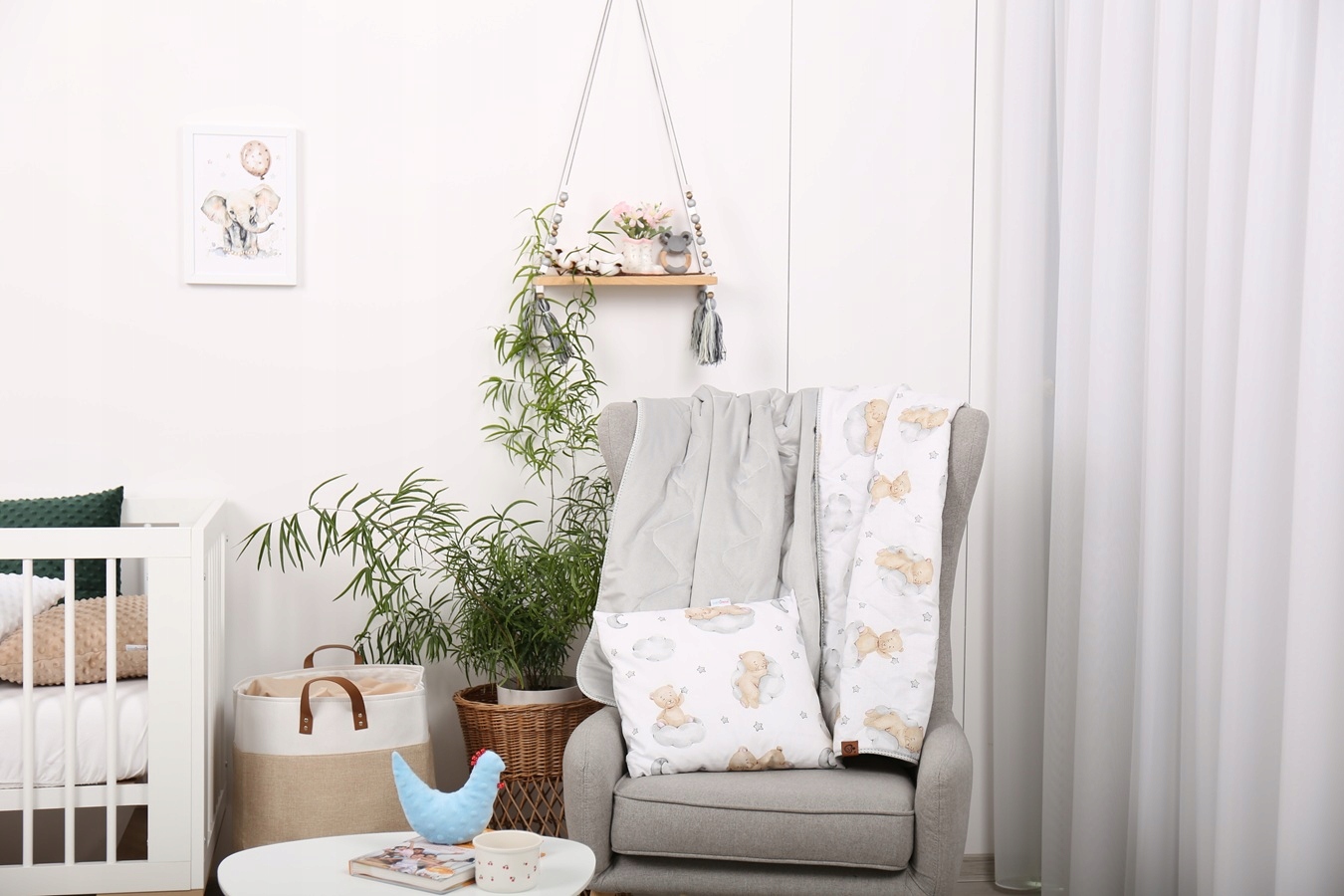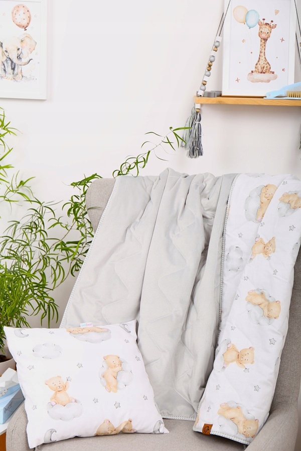 ● подушка 40x40 см - с анти -аллергической вставкой и наволочкой, закрепленной на молнии (легкое удаление и промывание). Стеганое одеяло 100x145 смг - большой, мягкий и уютный. Ребенок может спать посередине, как в спальном мешке или накрыть себя, как традиционное одеяло.