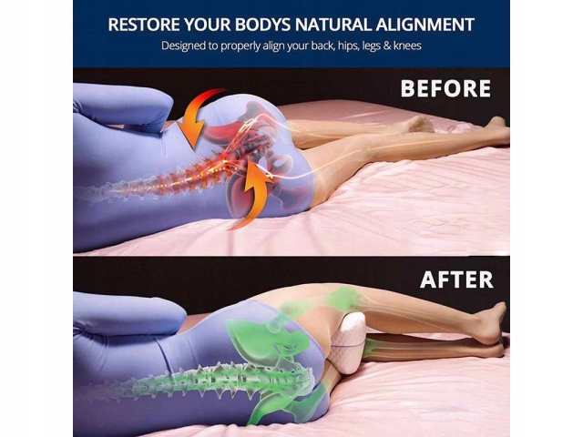 Подушка-разделитель между ногами и коленями поддерживает правильное положение позвоночника во время сна.